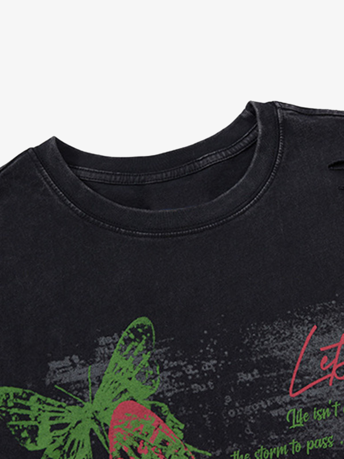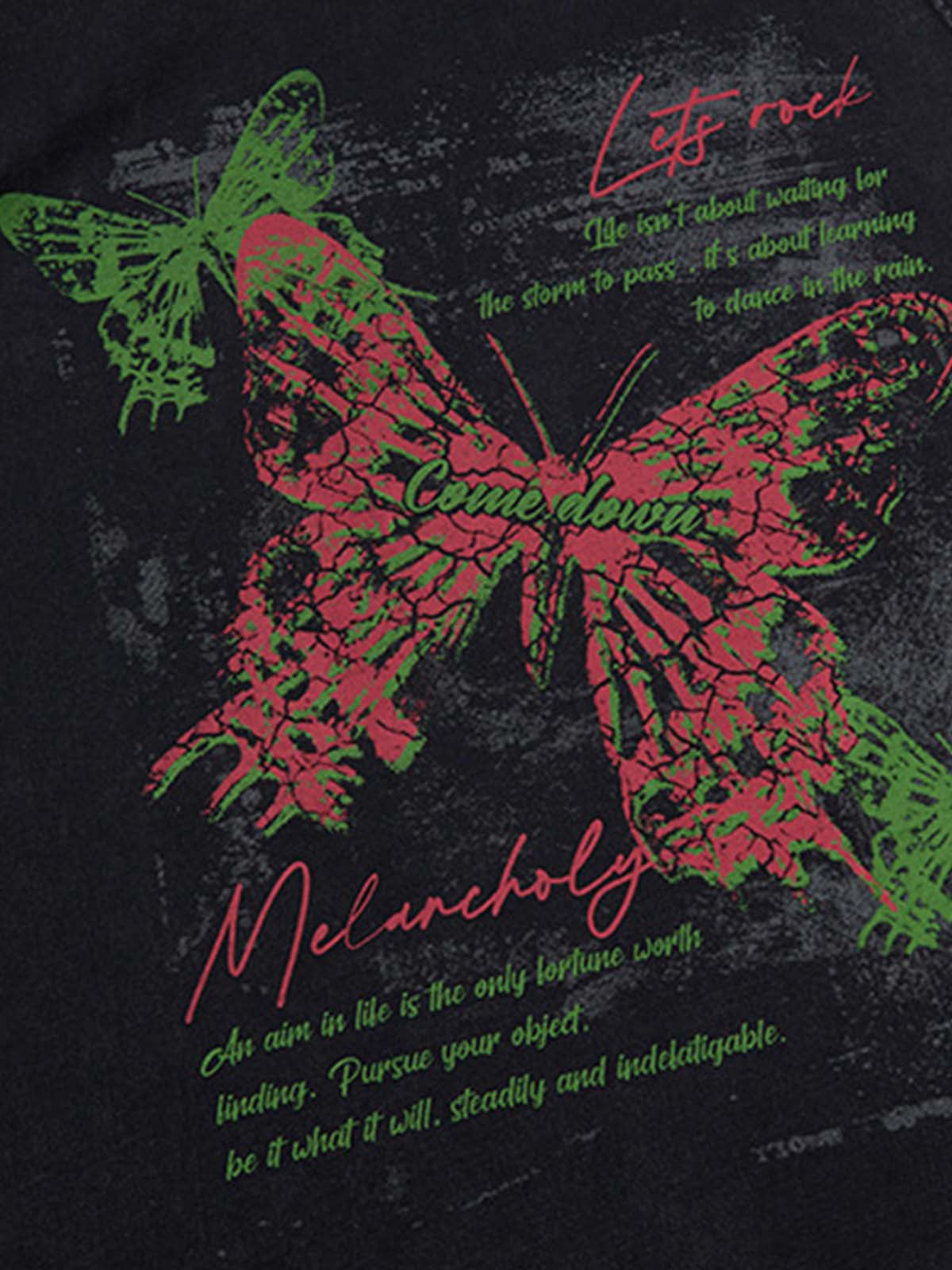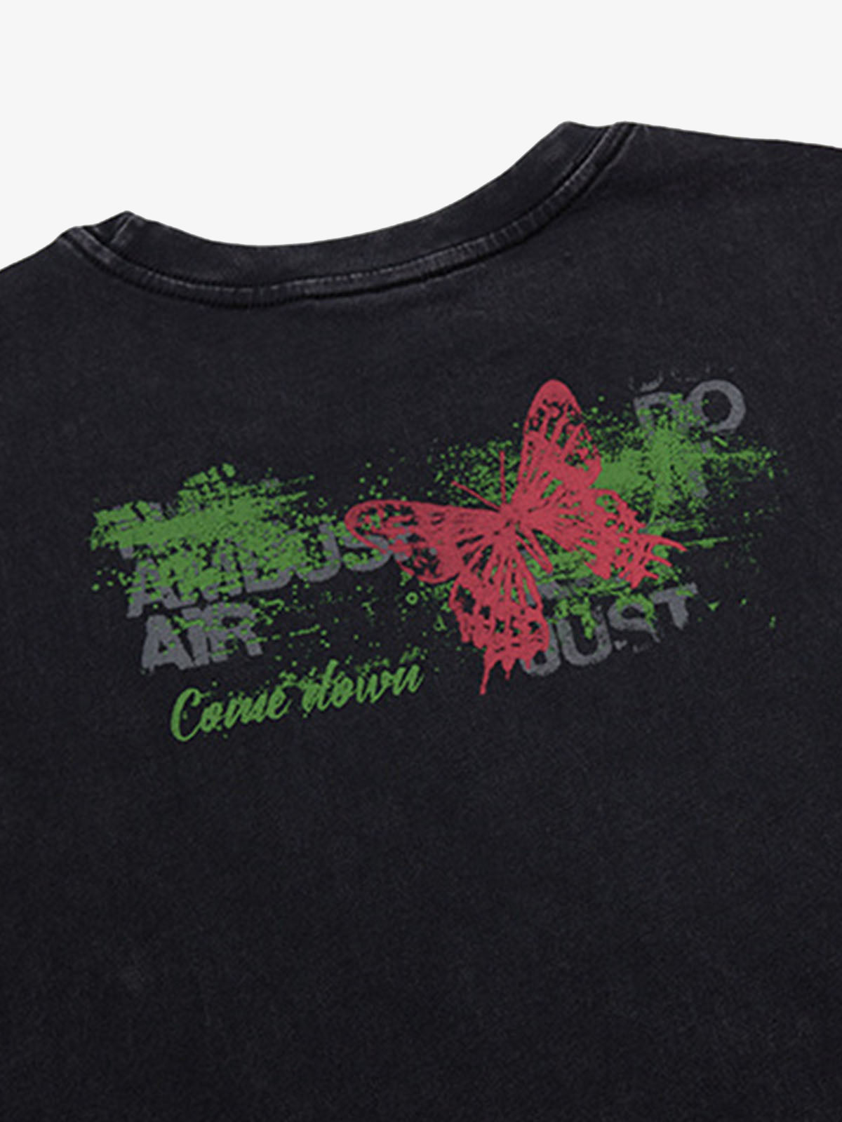 • Designelemente: Lebhafter Schmetterlings-Grafikdruck, Used-Look-Details, fettgedruckte Textüberlagerungen