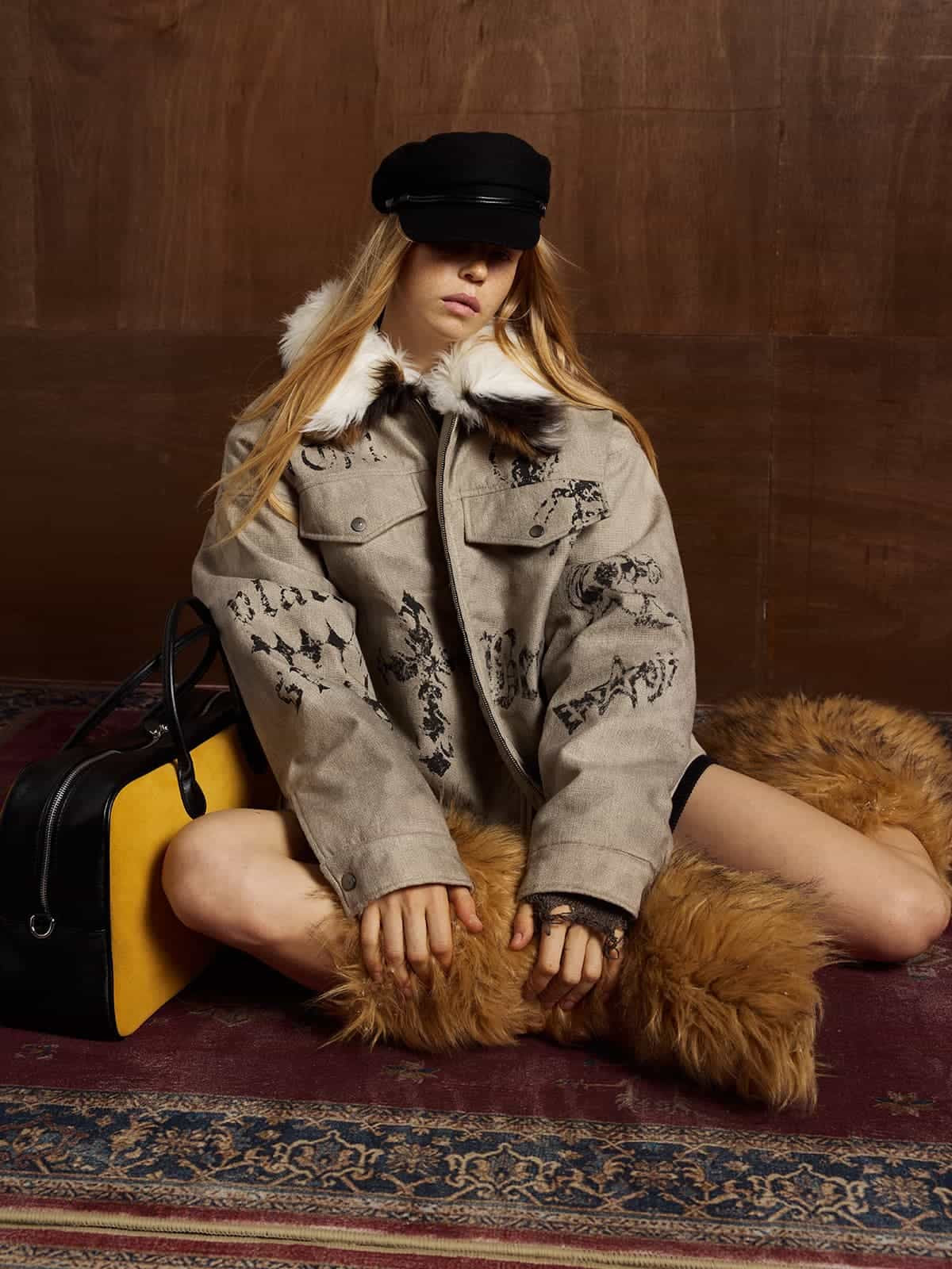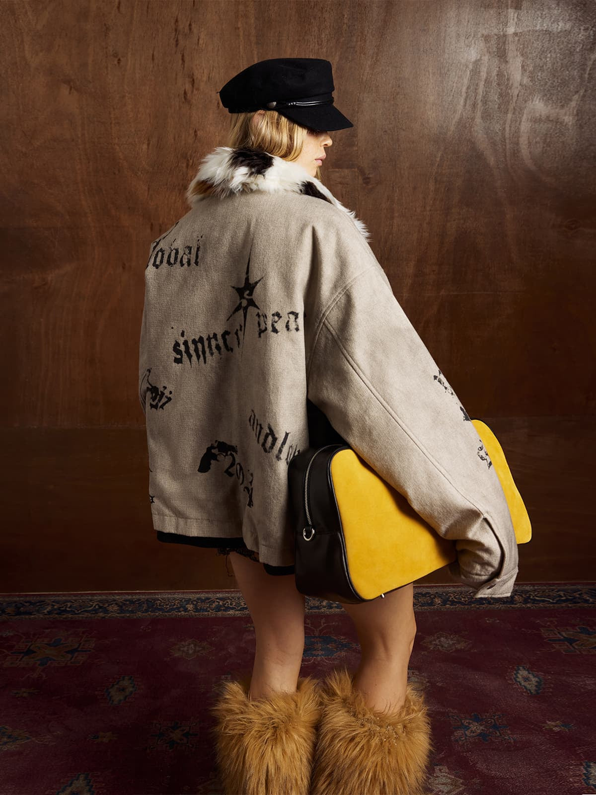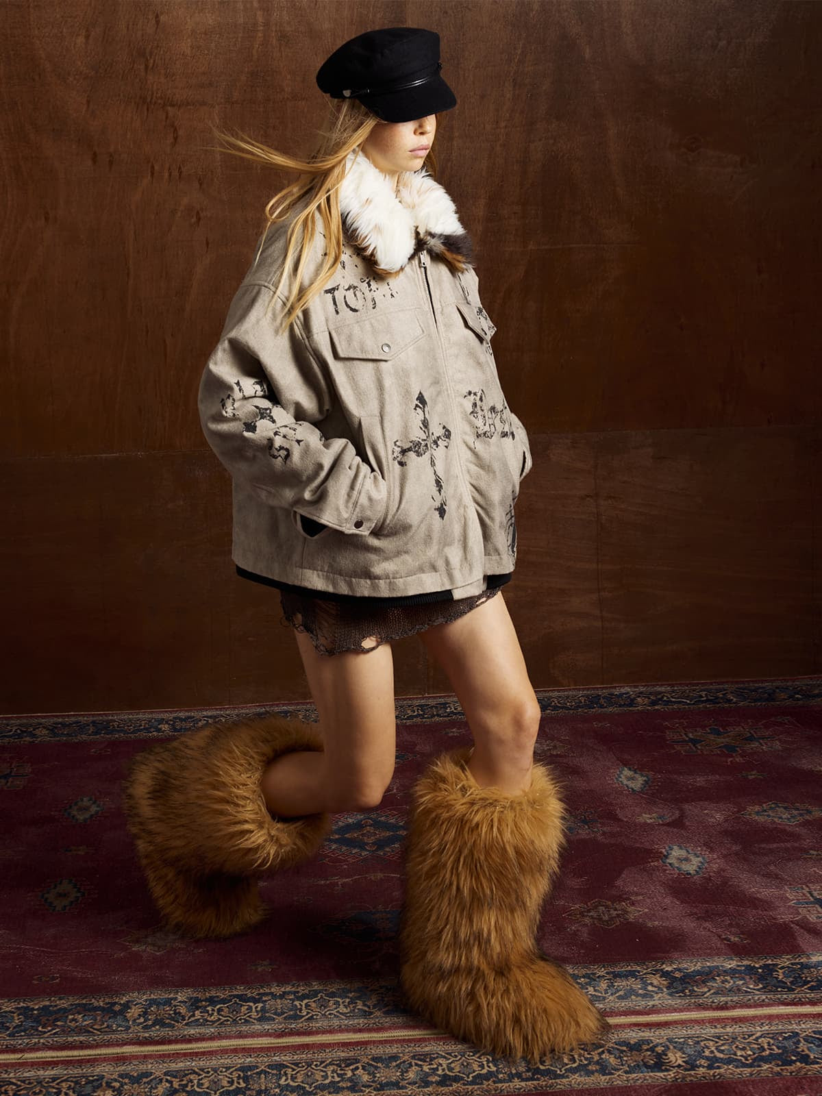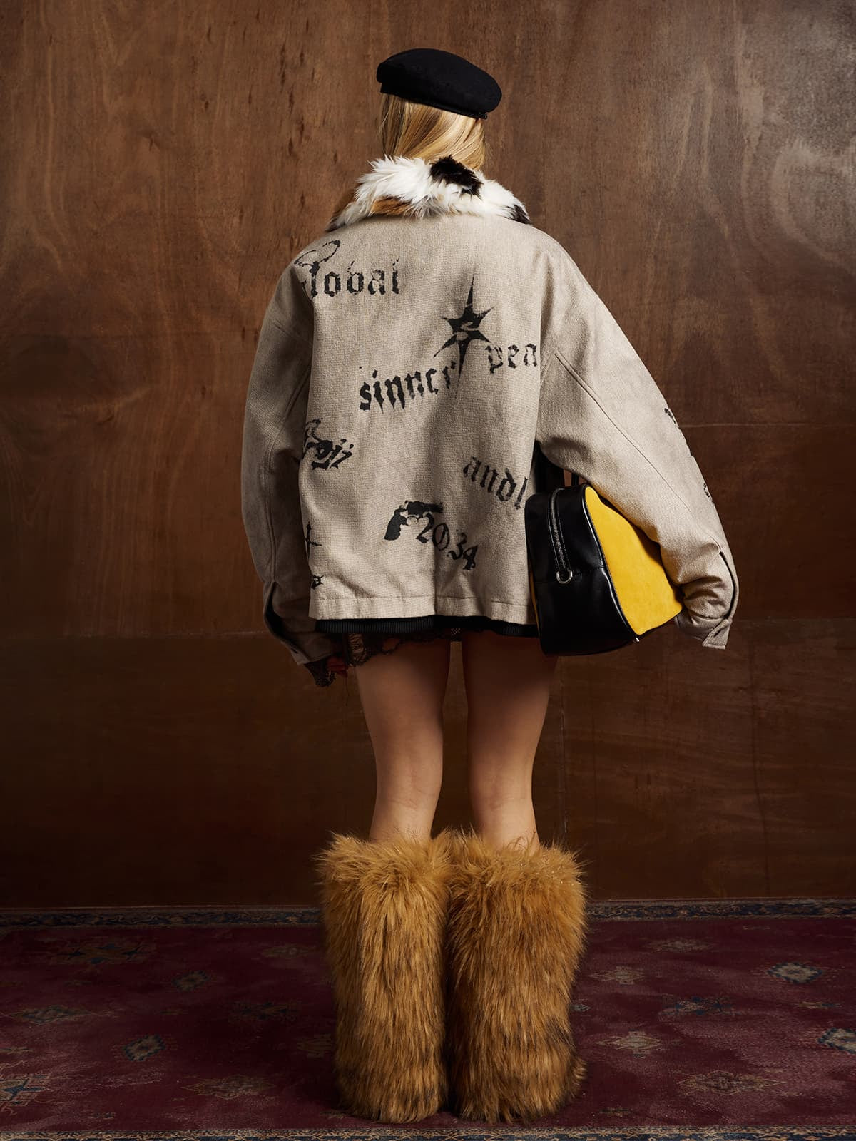 Gothic Letter Print Fur Collar Quilted Cotton Jacket