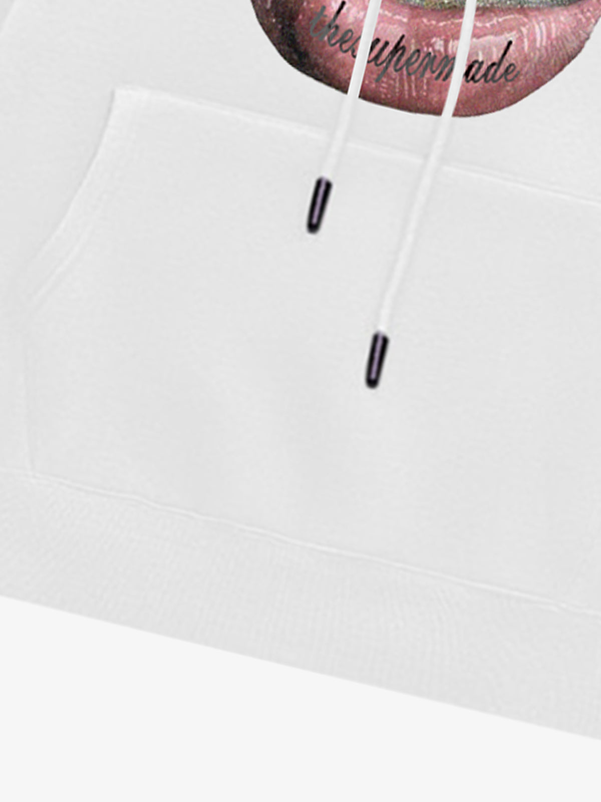 • Designelemente: Große Lippengrafik mit komplizierten Zahndetails, Kapuzenpulloverdesign mit Vordertasche