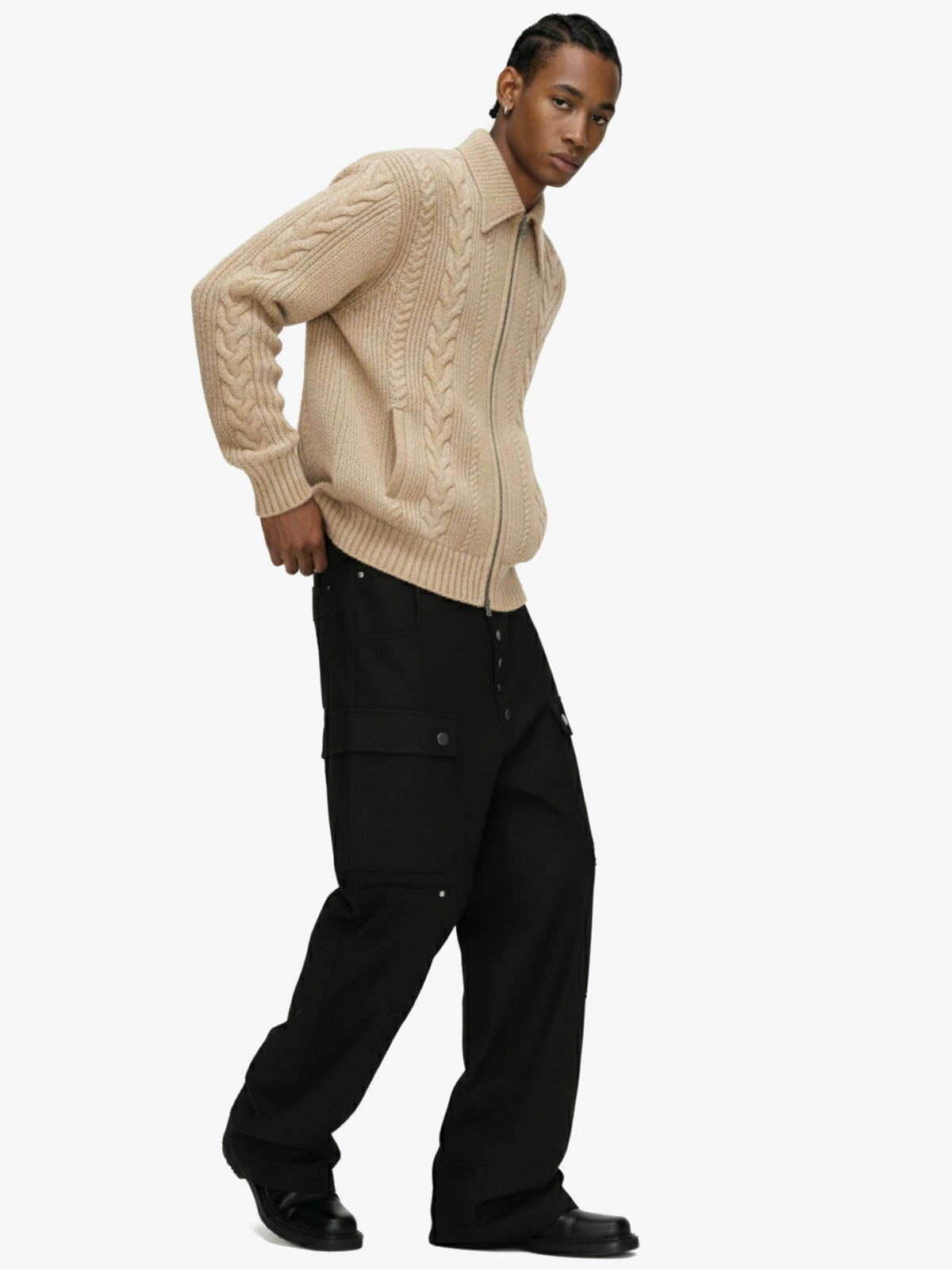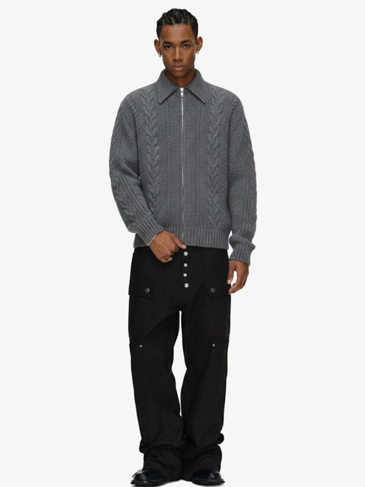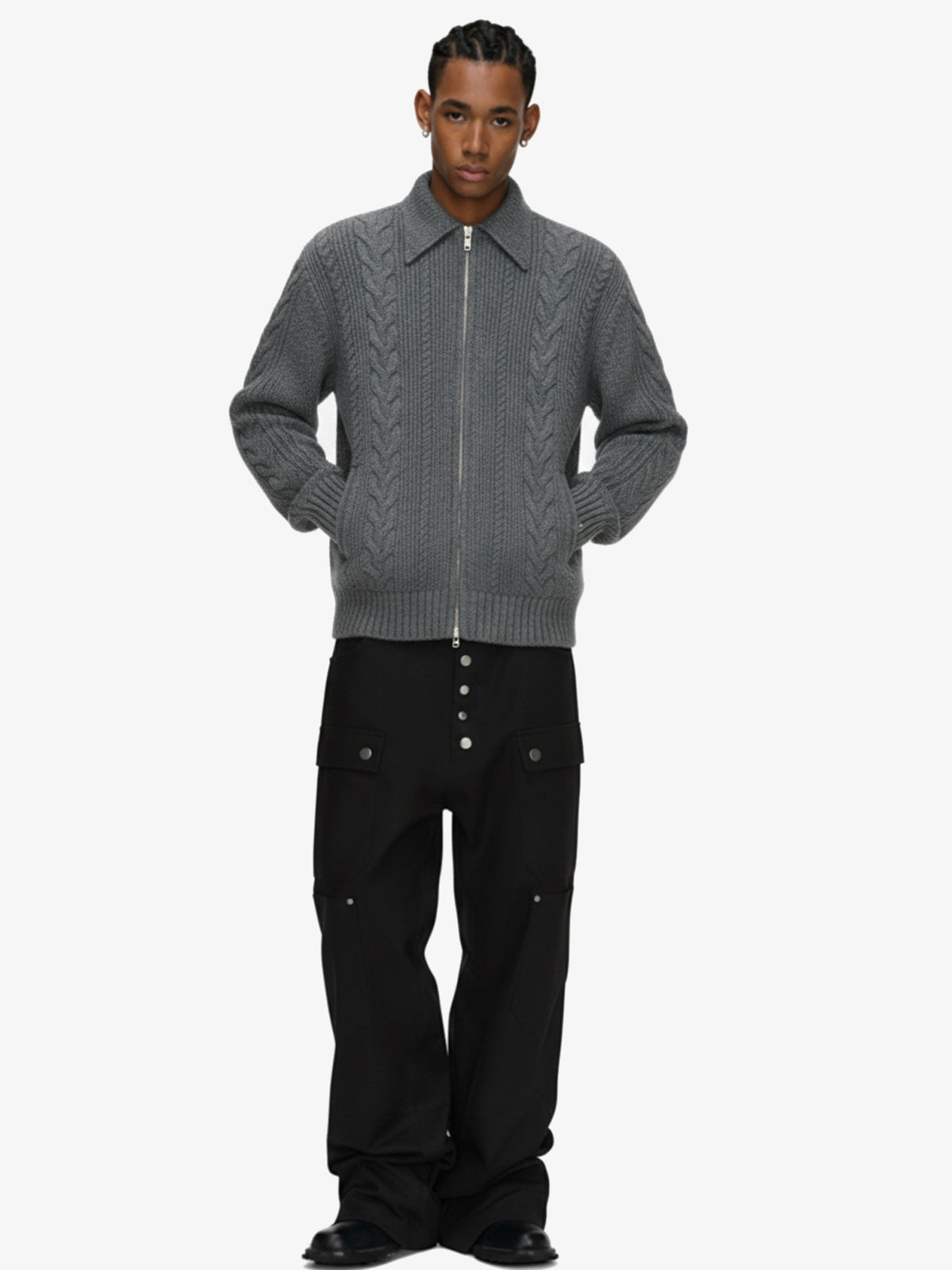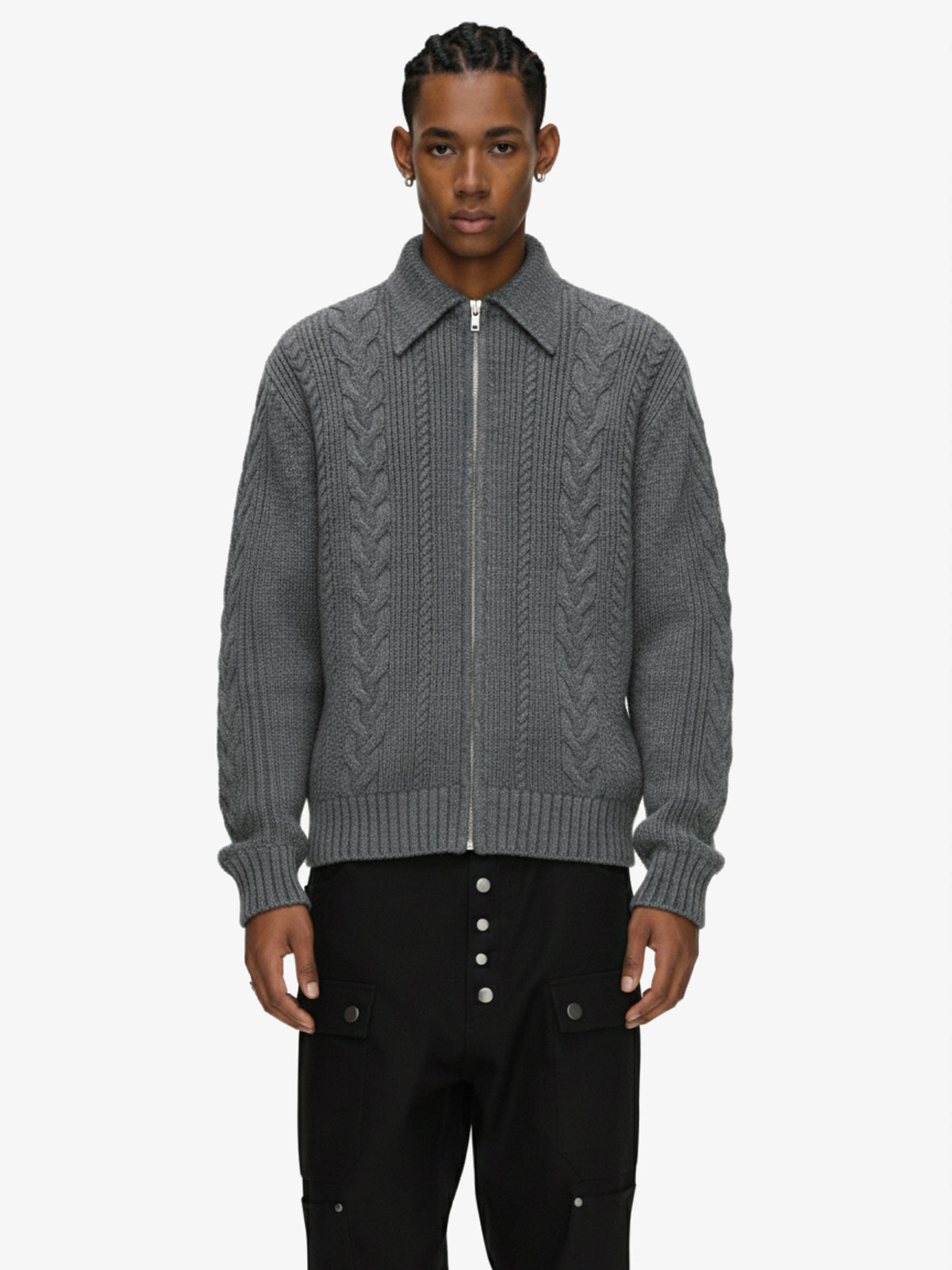 •    Design Elements: Braided cable knit pattern, full-length front zipper, ribbed cuffs and hem