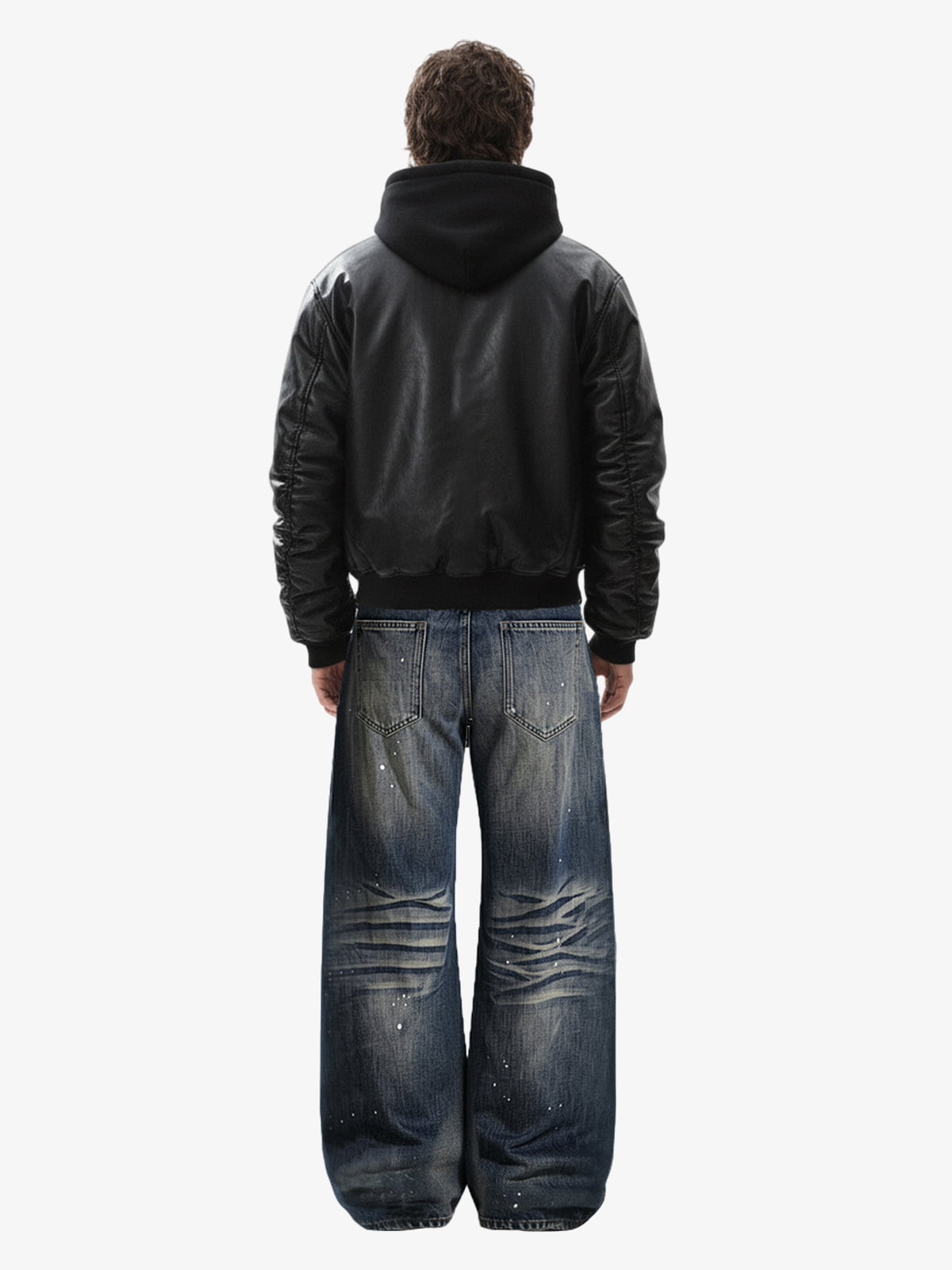 Retro Leather Faux Two-Piece Hooded Padded Bomber Jacket