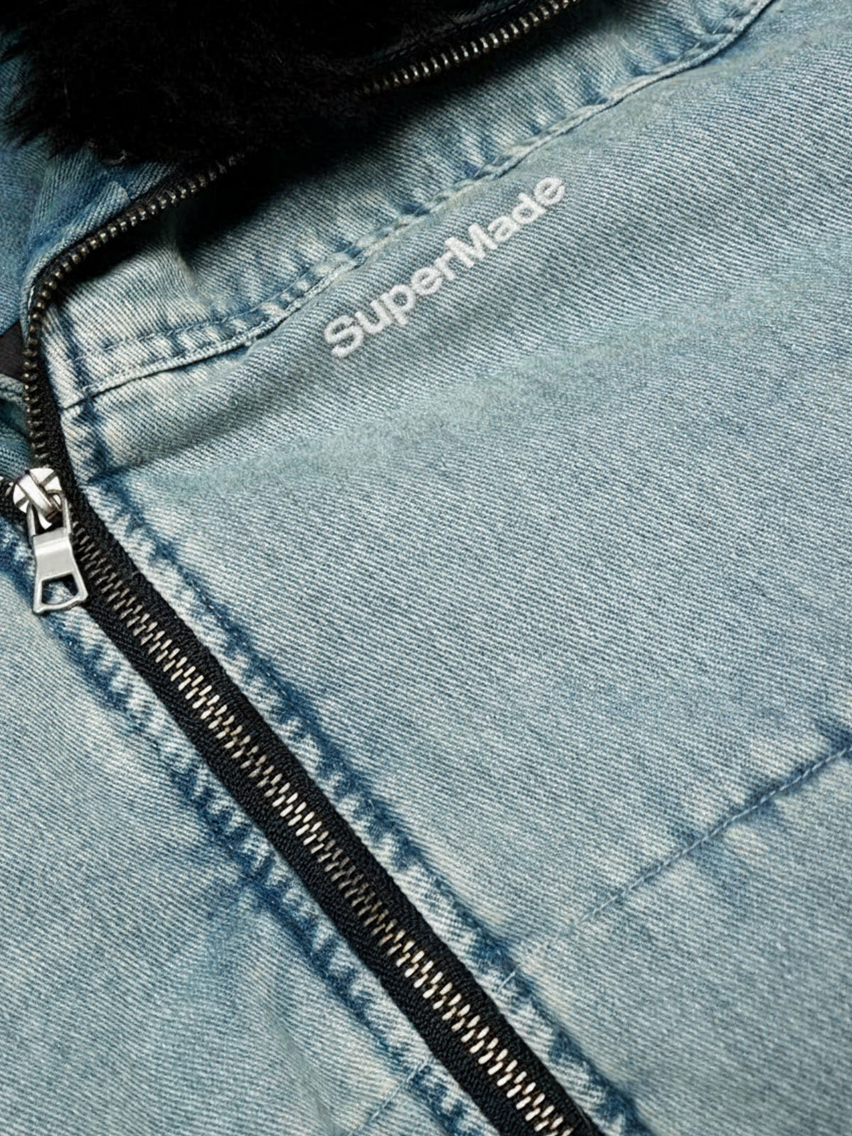 Retro Washed Denim Faux Fur Collar Quilted Jacket