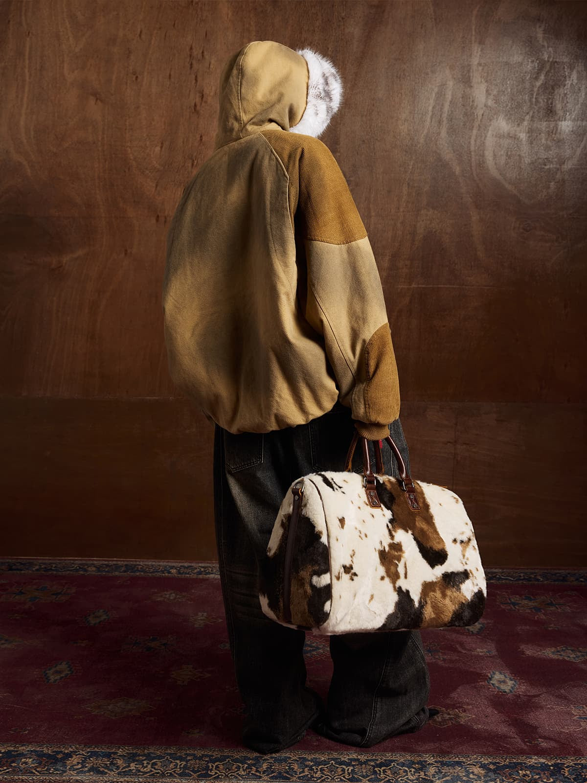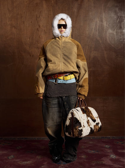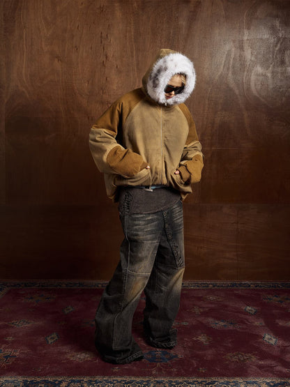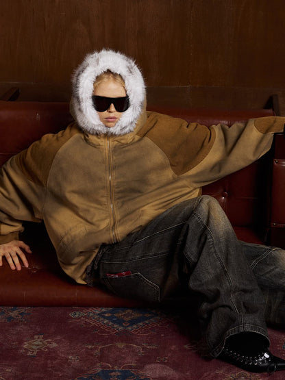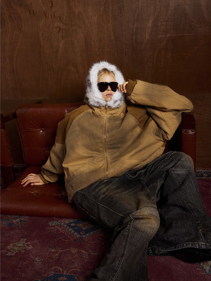 Street Vintage Fog-Dyed Fur Collar Patchwork Hooded Padded Jacket