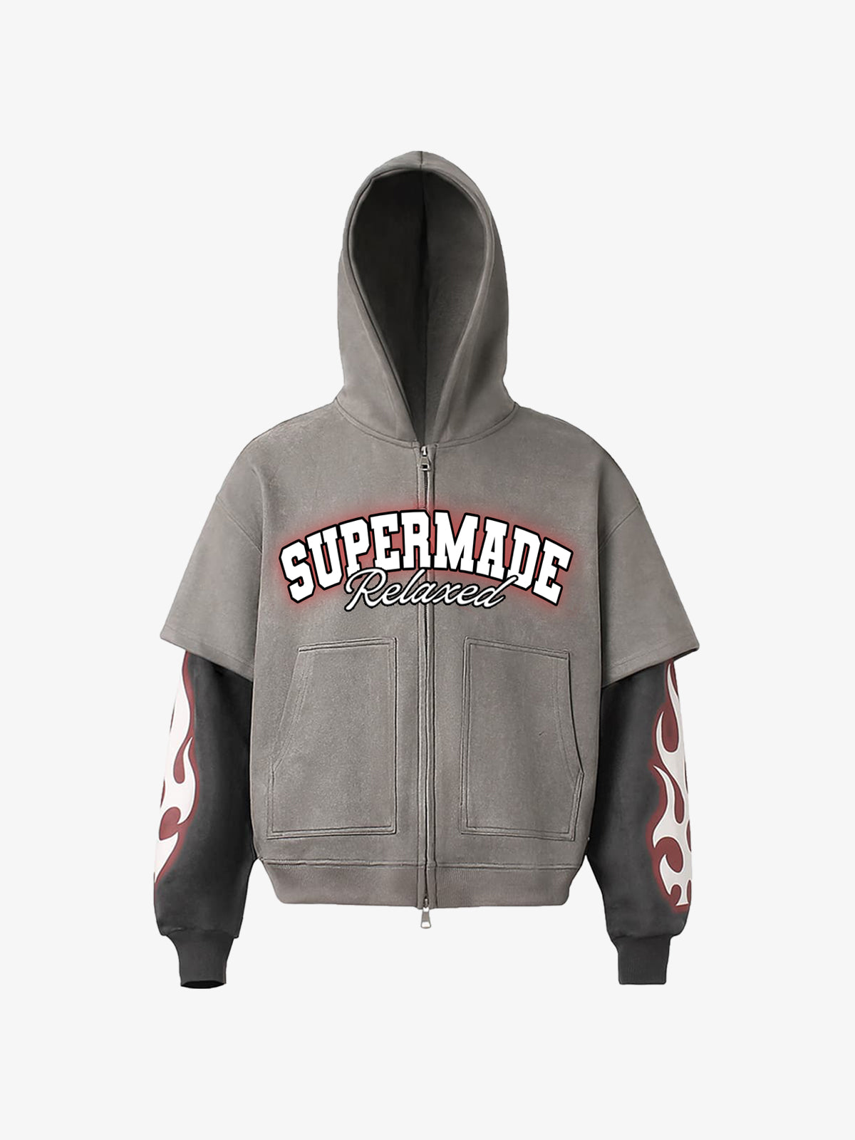• Designelemente: Auffällige Flammendrucke auf Ärmeln, Vordertaschen, zentraler Markentext