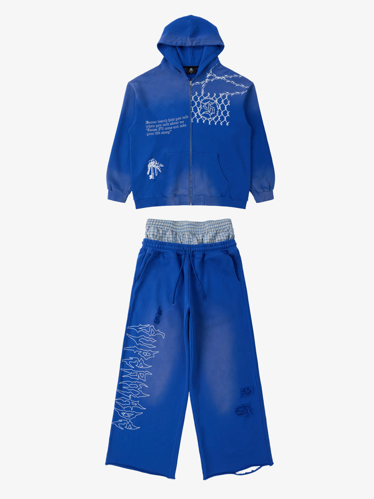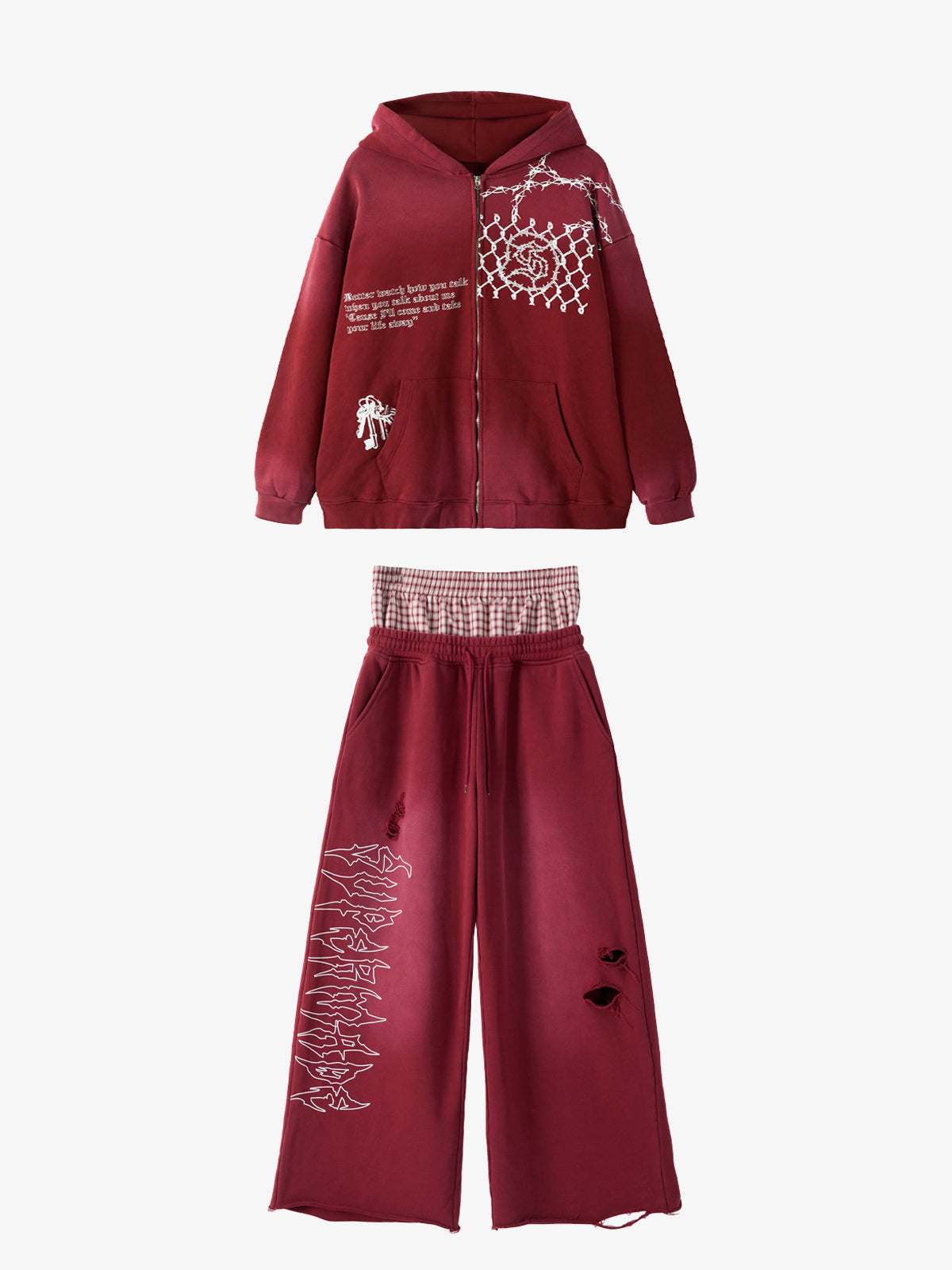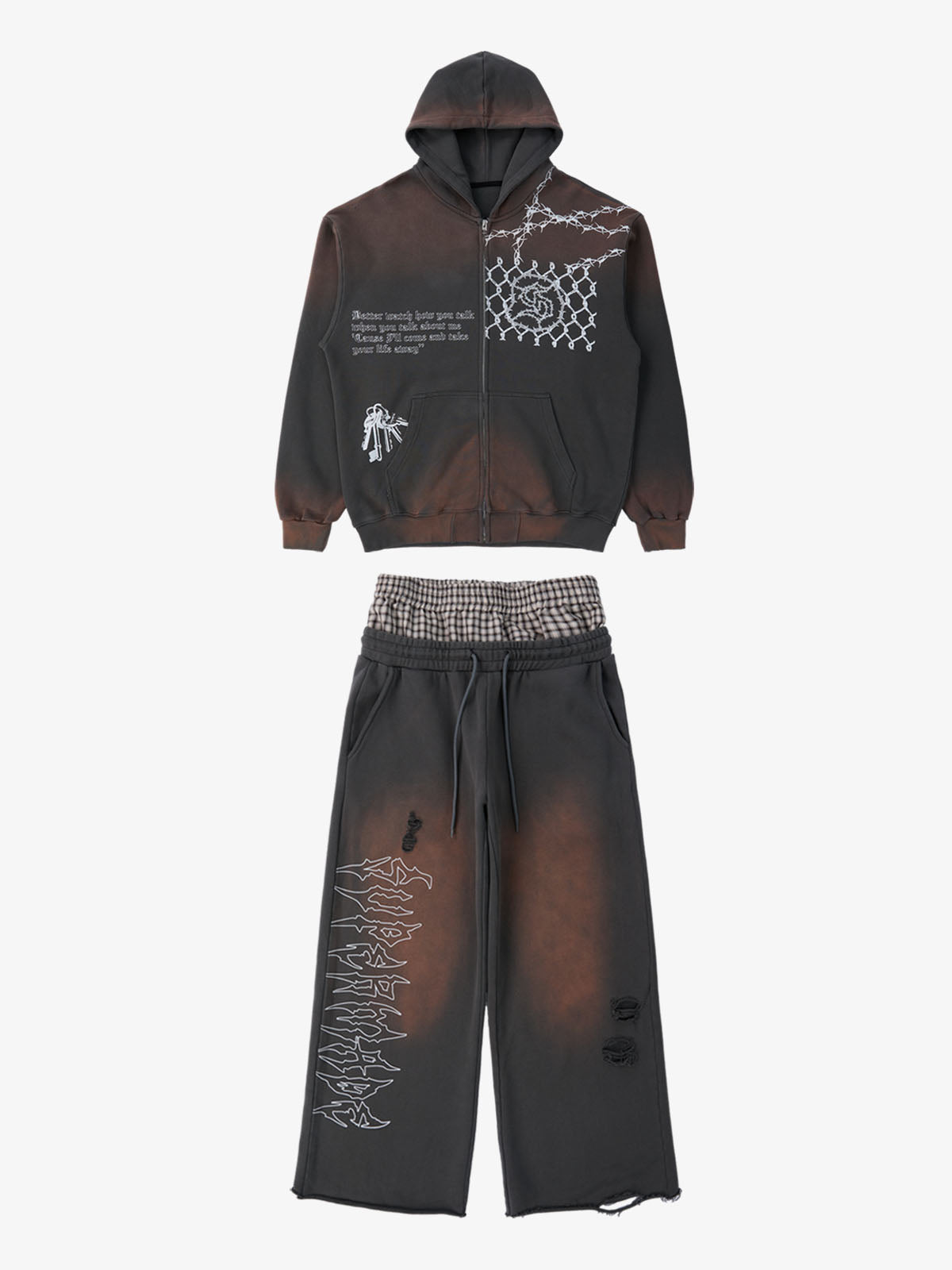 Detail Features: Vintage-inspired distressed print, patchwork design for added texture, sweatshirt fabric with a soft yet structured feel, coordinated top and bottom set