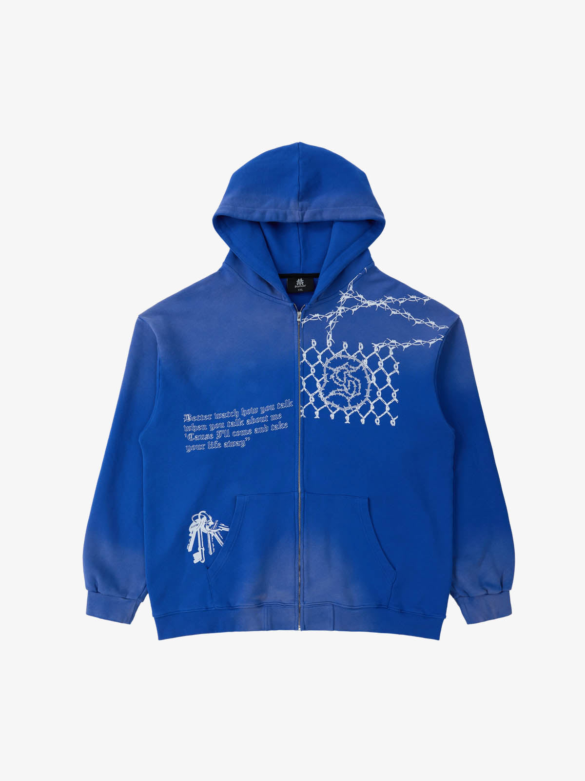 Distressed streetwear style loose sleeveless vest, decorated with a soccer print pattern and distressed and washed details, with metal eyelet details.