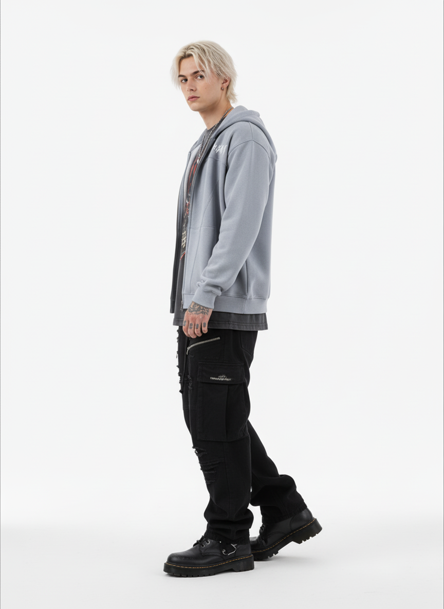 •    Design Elements: Distinctive typography on sleeves, front zipper closure, hooded design