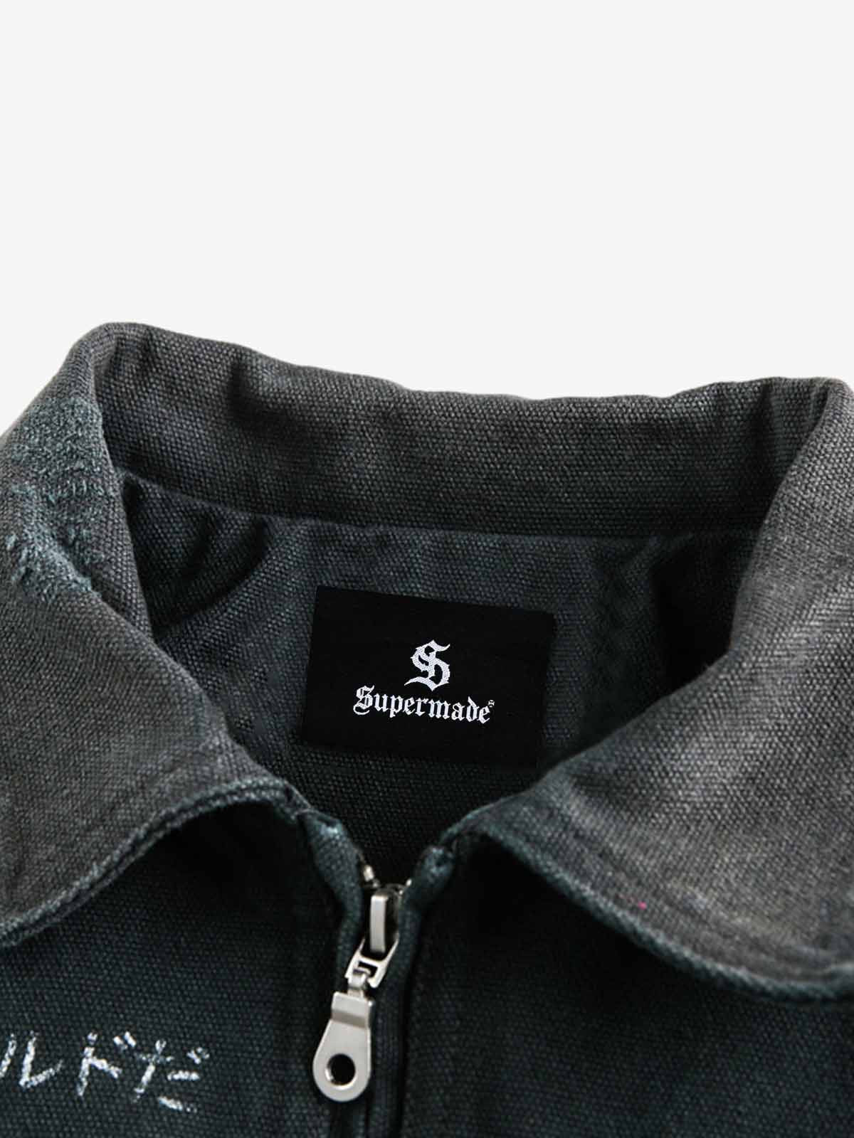 • Detail Features: Back graphic print with Japanese text and figure illustration, two side pockets, front zipper closure, ribbed cuffs and hem