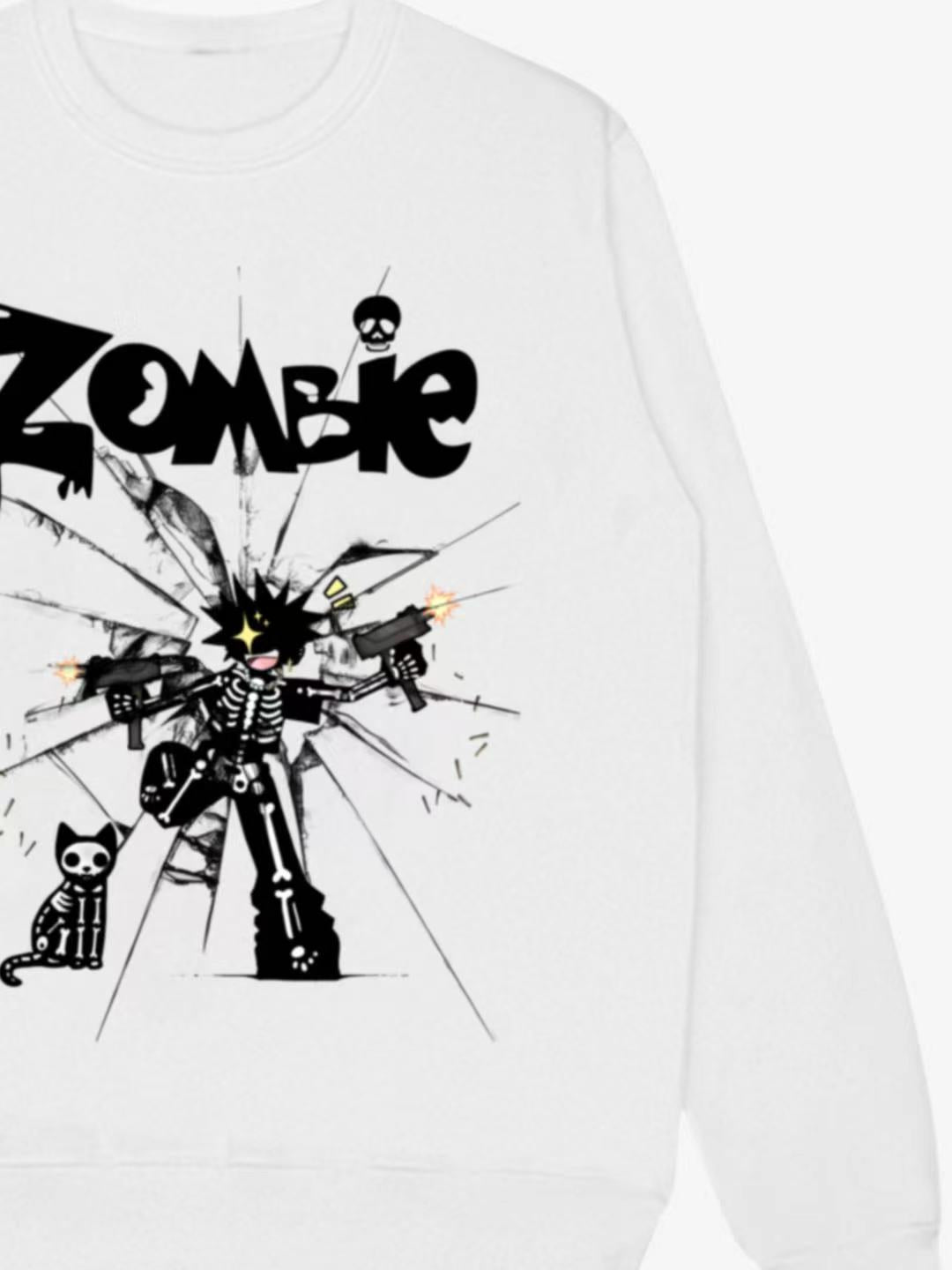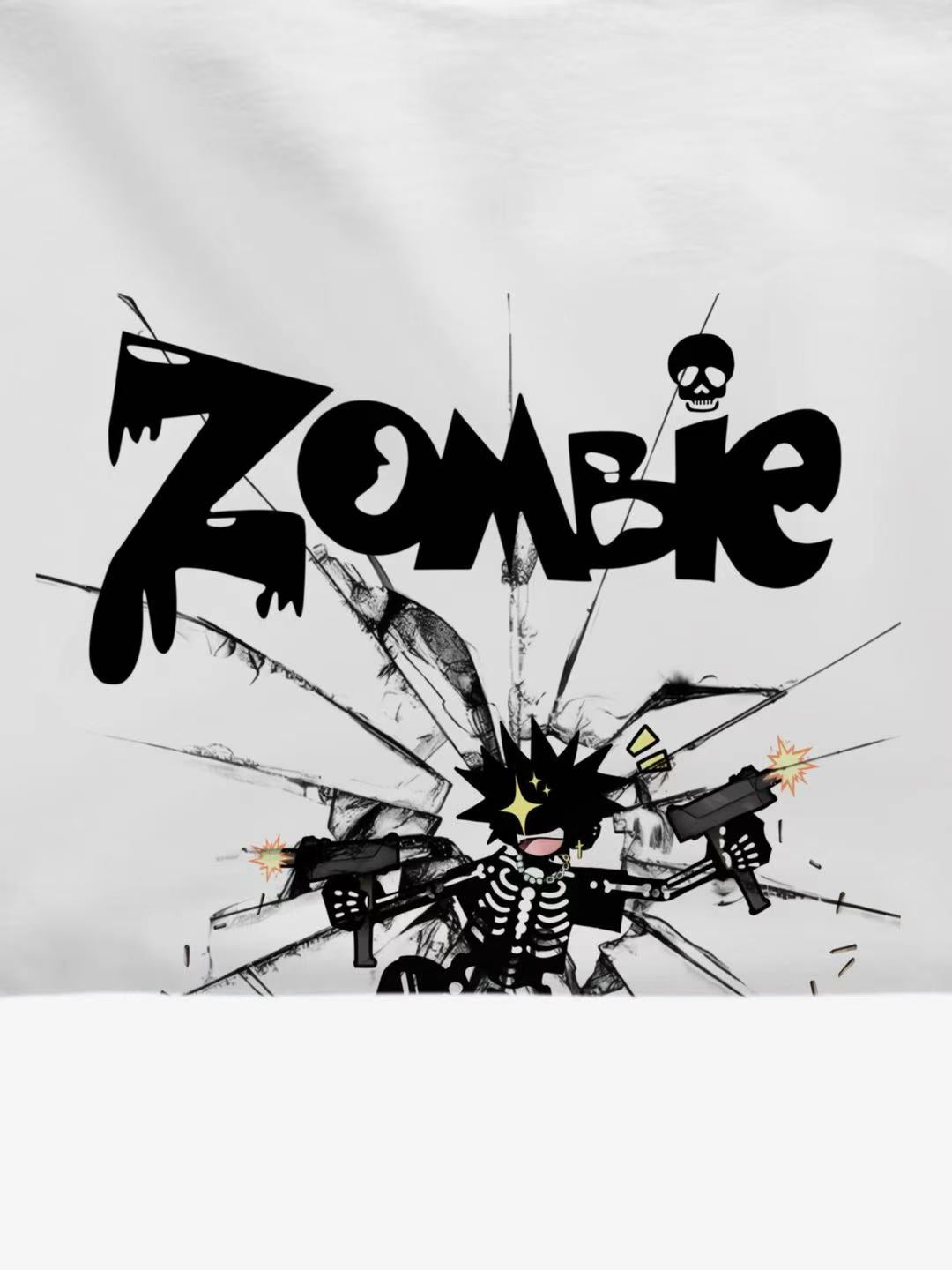 • Designelemente: Fettgedruckter „Zombie“-Text mit dynamischem Grafikdesign, Skelettfigur mit Waffen, verspielte Katzenillustration