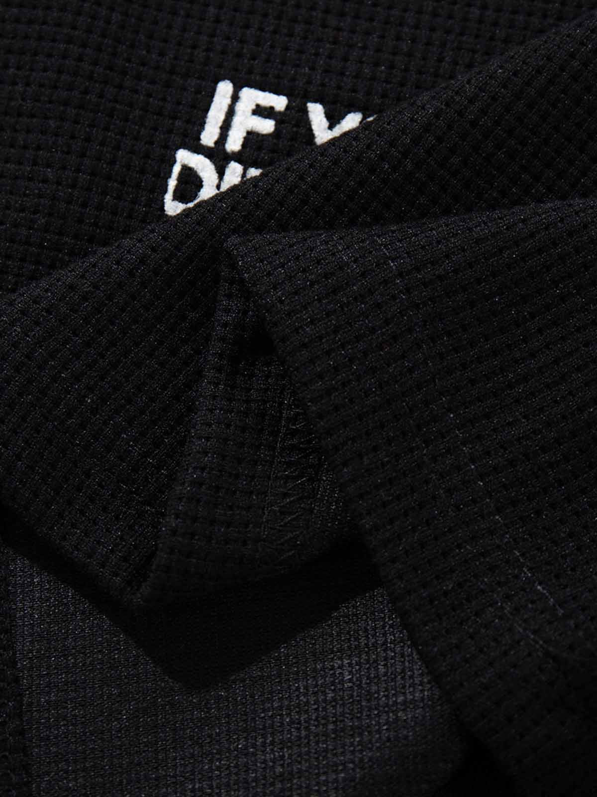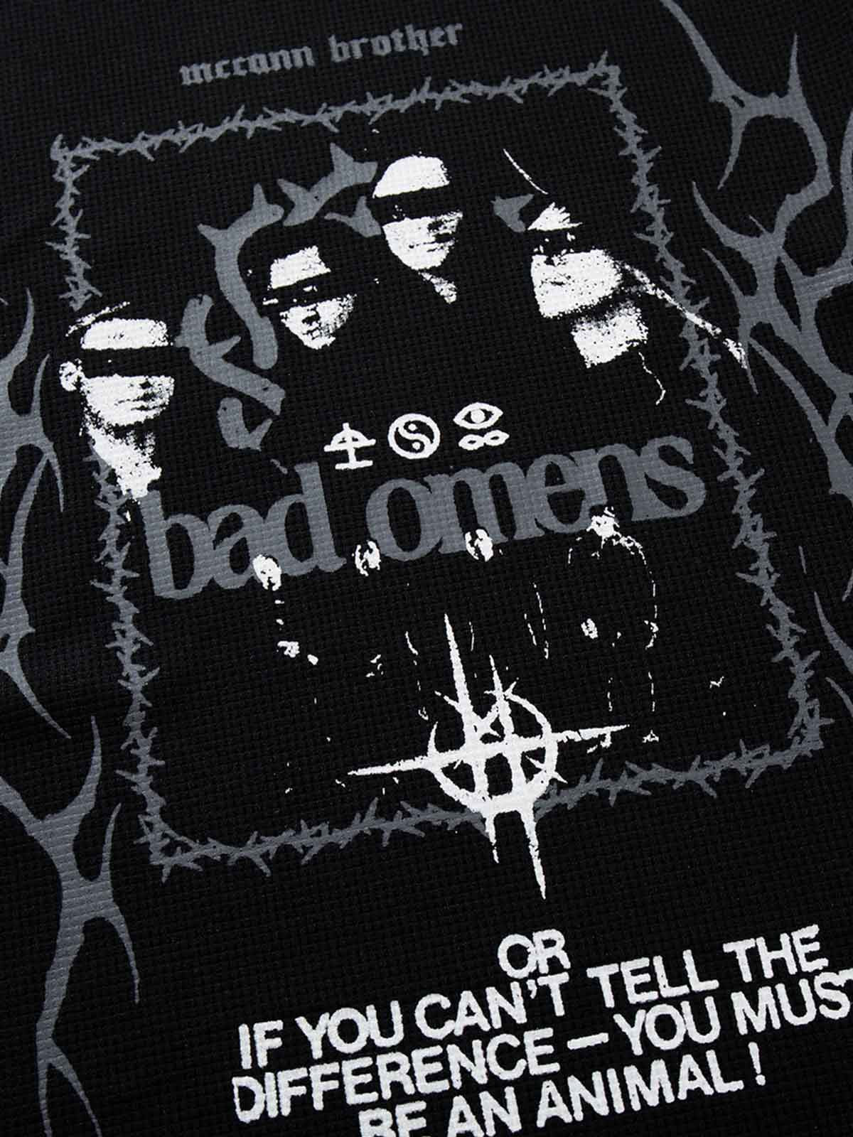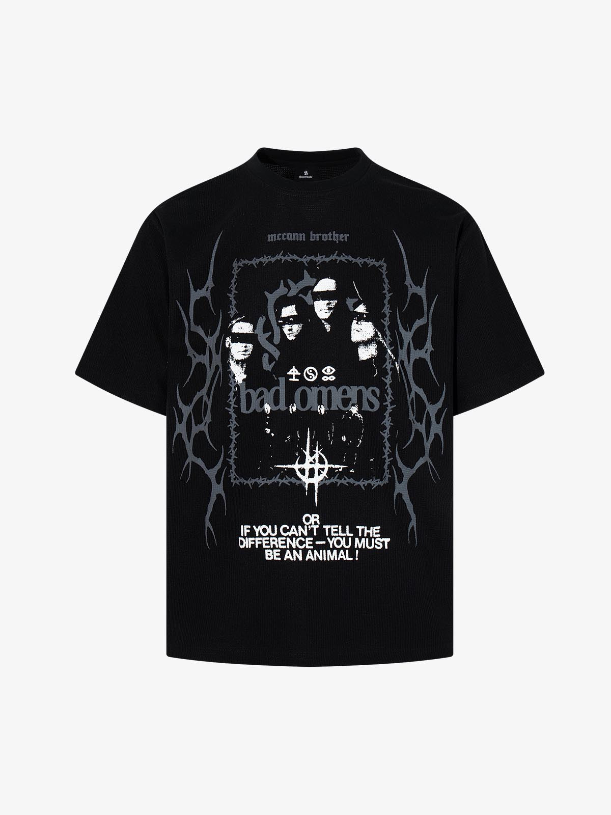 A graphic T-shirt featuring a blindfolded portrait combined with bold gothic-style text prints. The layered composition creates a strong visual impact, giving it a dark and expressive look. Designed with a relaxed fit and soft fabric, it works well for everyday streetwear styling.