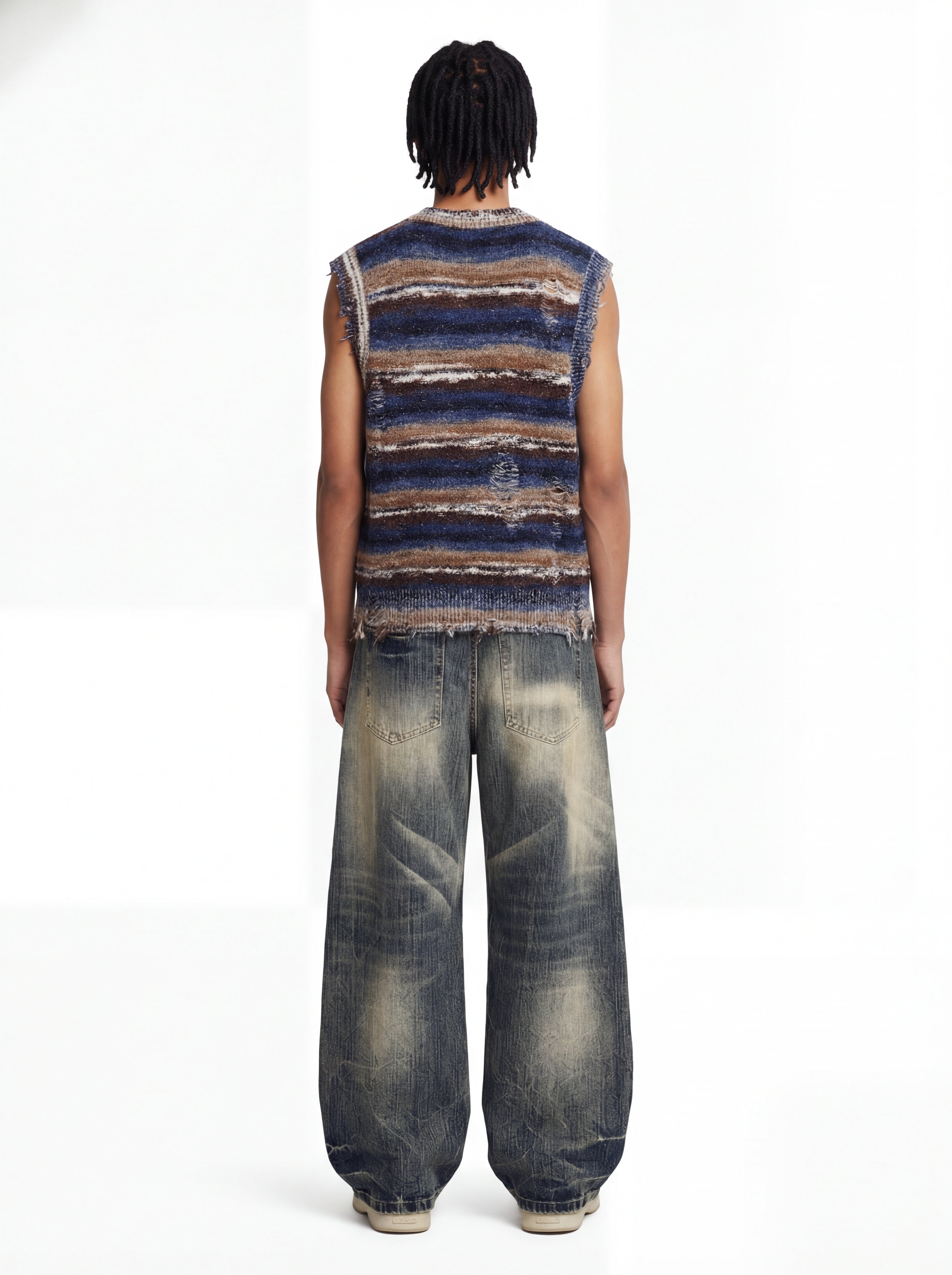 • Design Elements: Multicolor Striped Knit, Distressed Frayed Edges, Textured Yarn