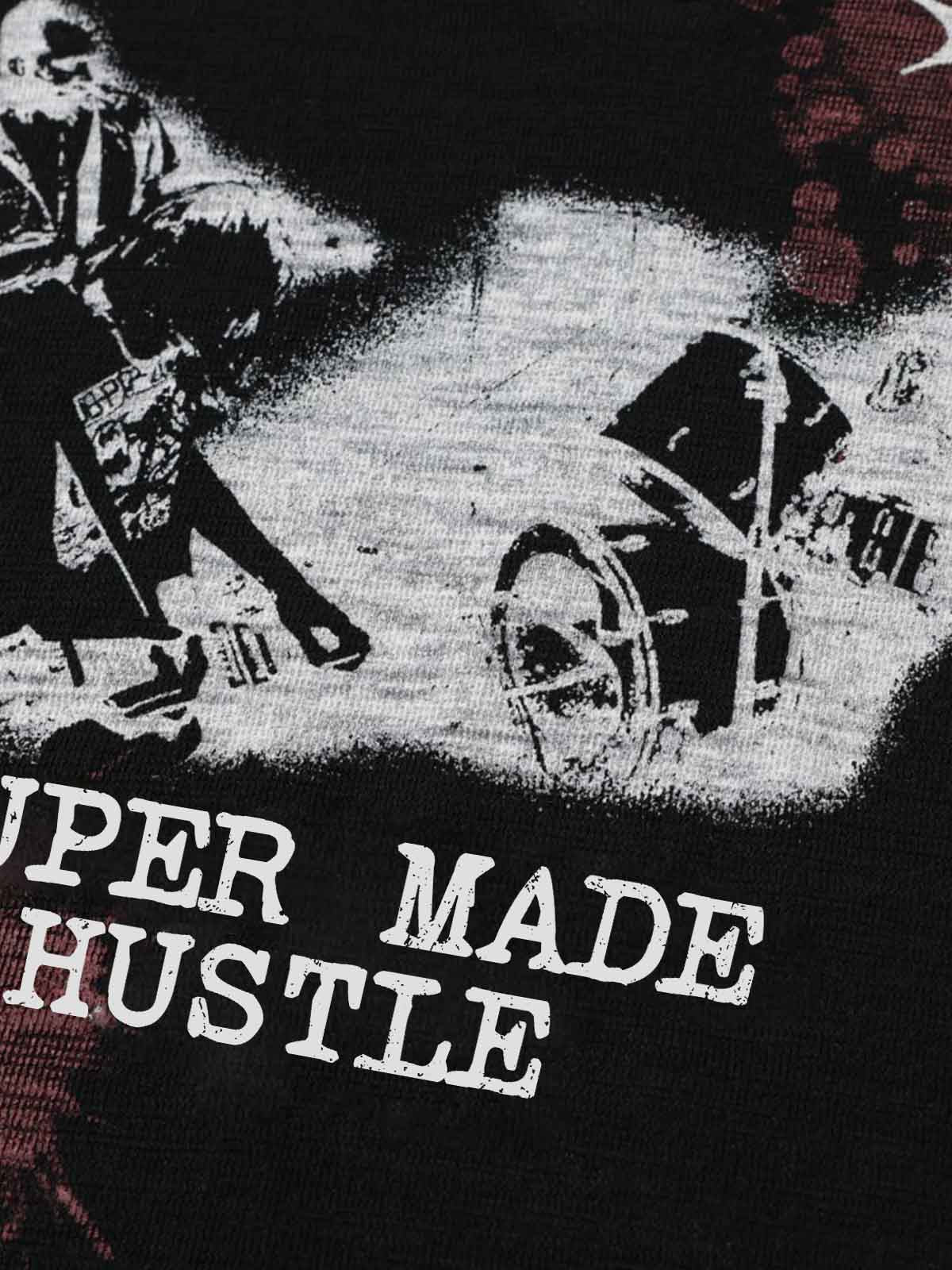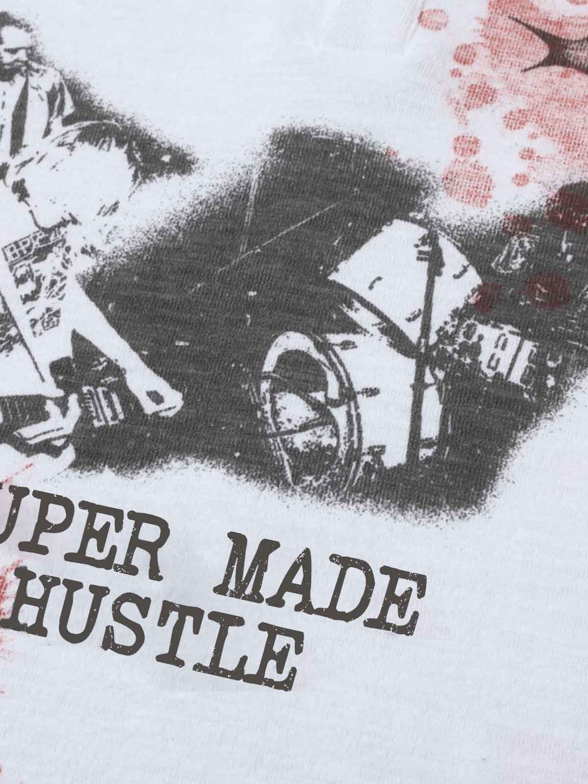 A statement long sleeve tee featuring bold "Super Made Hustle" graphics with splash-style prints and star elements. Made from soft plain knit fabric, this piece combines streetwear attitude with everyday comfort. The henley neckline adds a subtle vintage touch while keeping the overall look clean and easy to style.