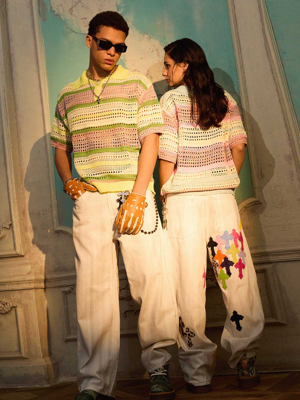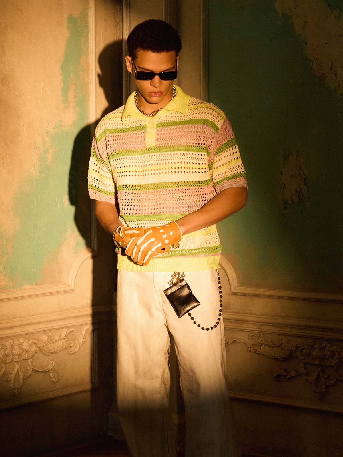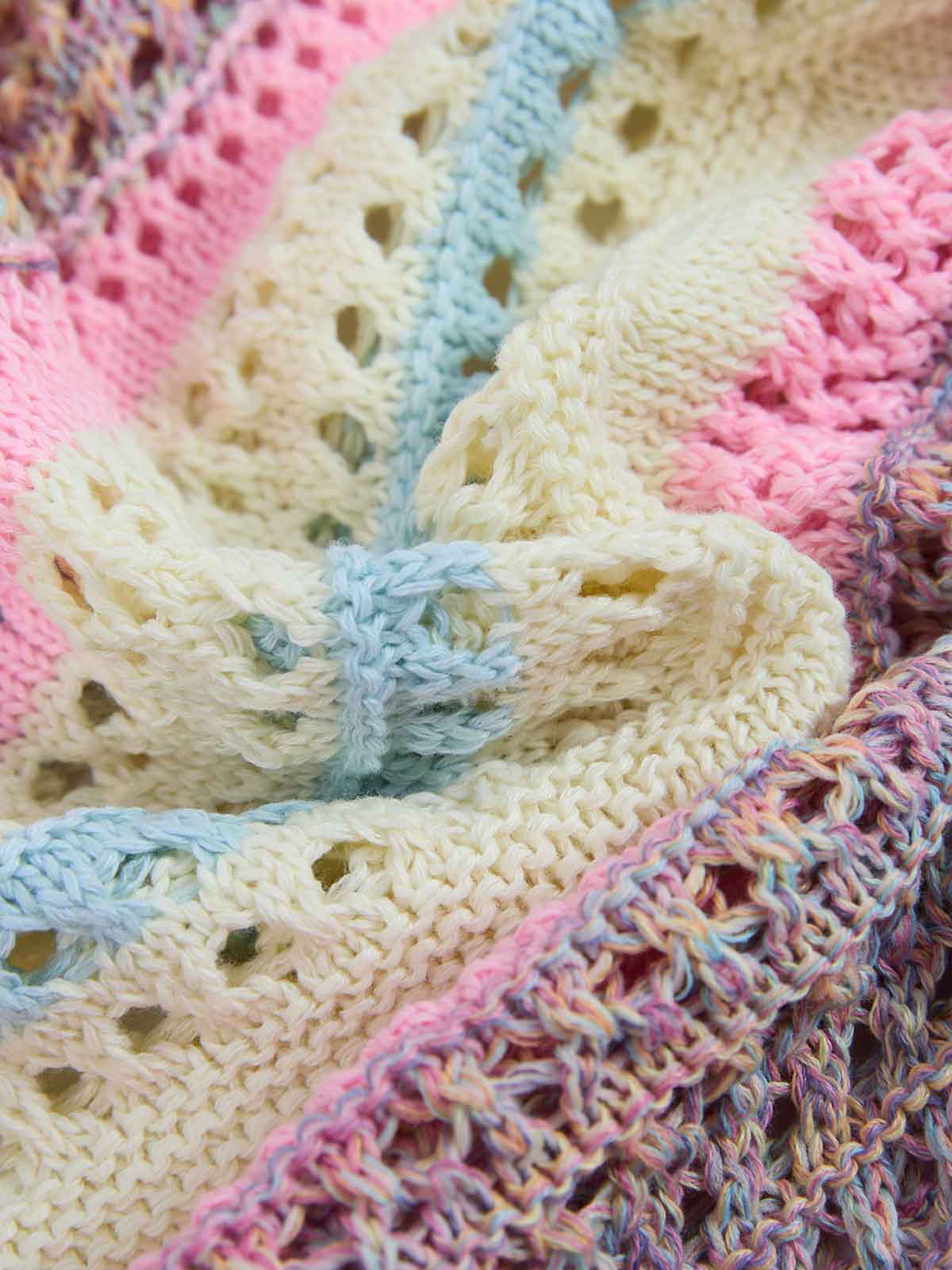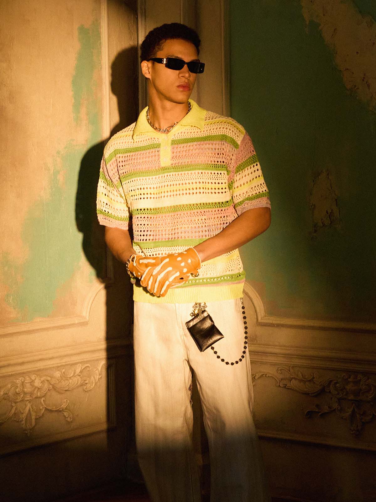 Crafted from a breathable cotton-blend knit, this pastel striped crochet polo blends retro texture with a soft, summer-ready palette. The openwork crochet construction enhances airflow while adding visual depth, making it ideal for warm weather layering or standalone wear. Finished with a ribbed collar, button placket, and contrast trims, it delivers a relaxed vintage vibe with a clean modern silhouette.
