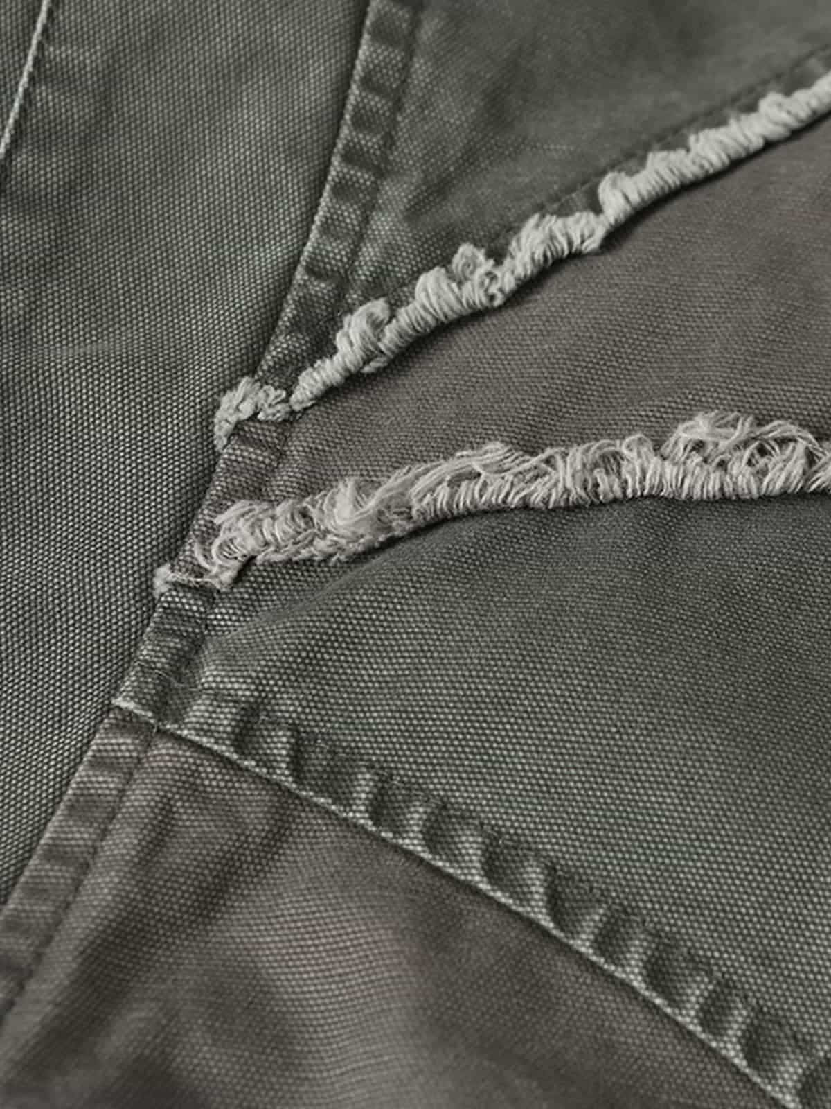 •    Design Elements: Distressed Edges, Panelled Construction, Zip-Up Closure