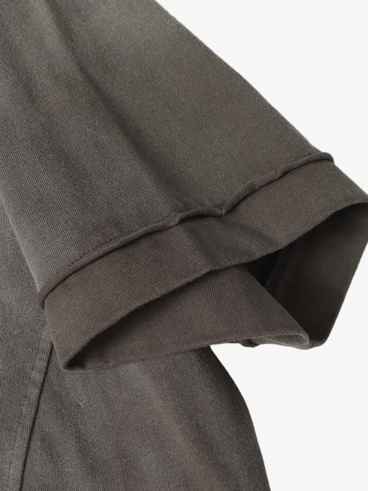 A relaxed knit T-shirt featuring a sprayed washed finish that creates a naturally faded texture across the fabric. The raglan sleeve construction and exposed raw edge seams add subtle structure and a slightly distressed streetwear look.