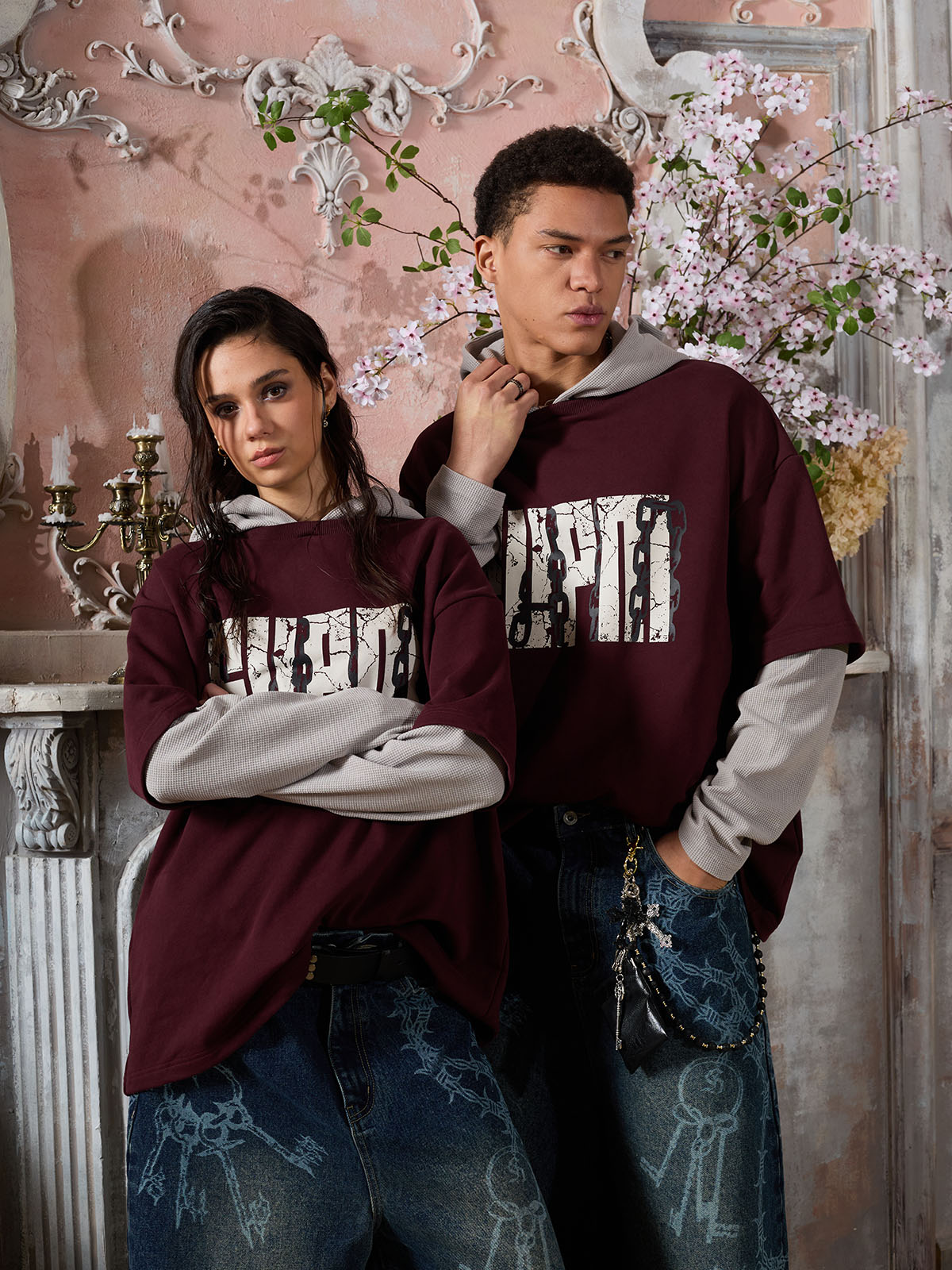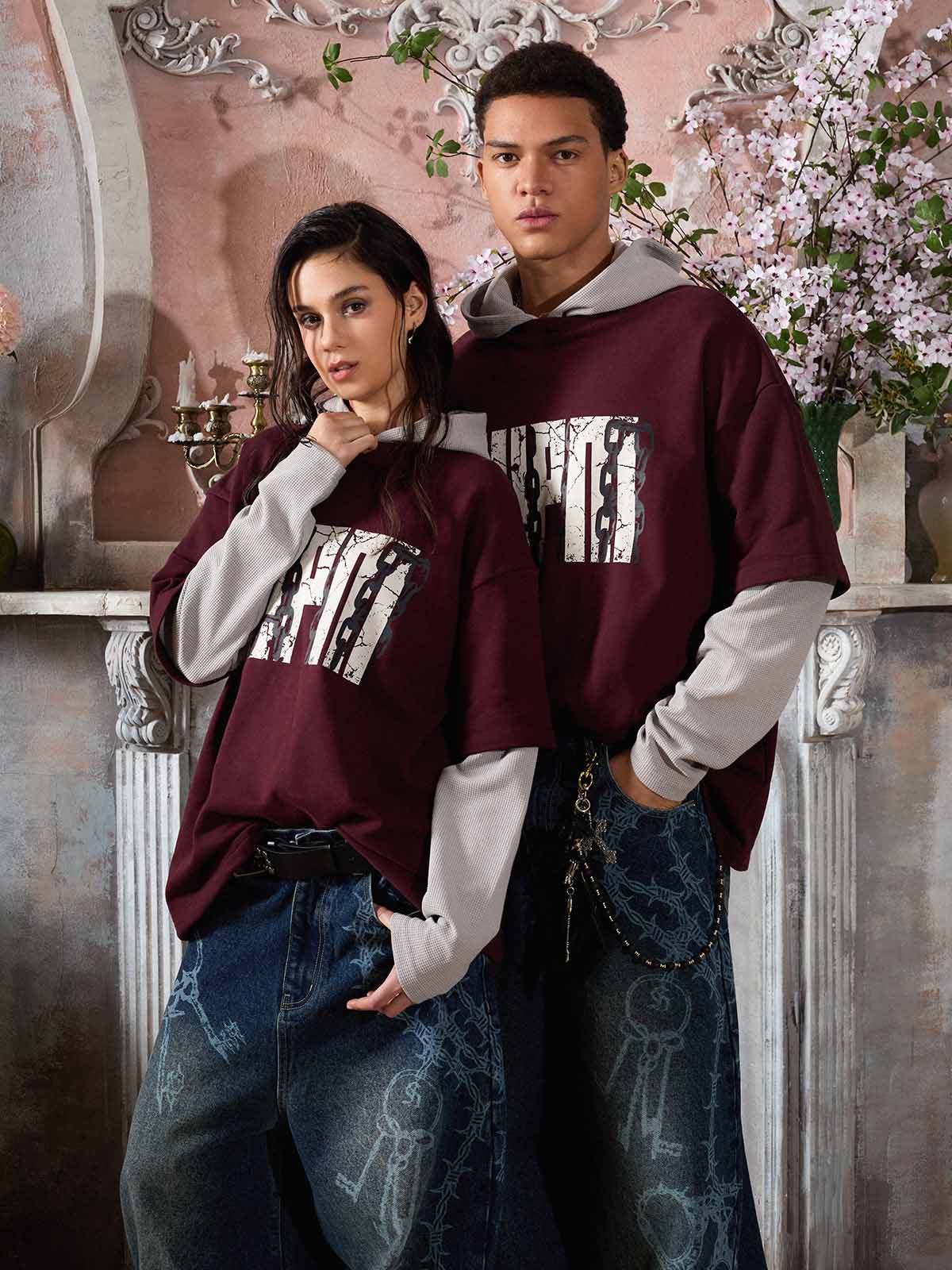 • Design Elements: Original graphic print, faux two-piece layered design, hooded long-sleeve structure