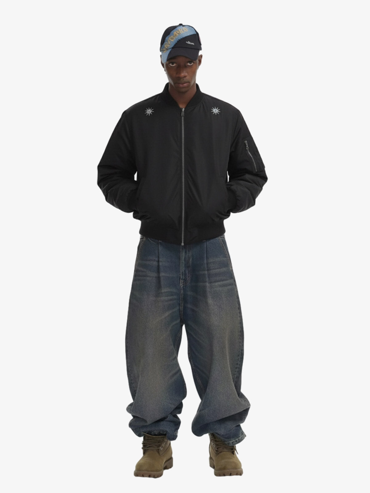 • Design Elements: Large Back Graphic Print, Star Patches on Shoulders, Embroidered Text Detail