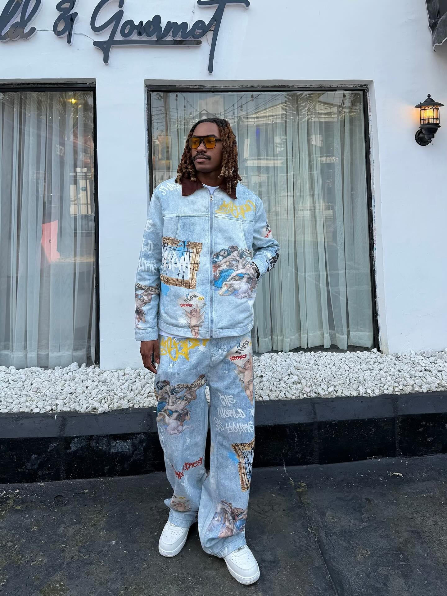 • Design Elements: Graffiti-style lettering, vintage art patches, artistic prints