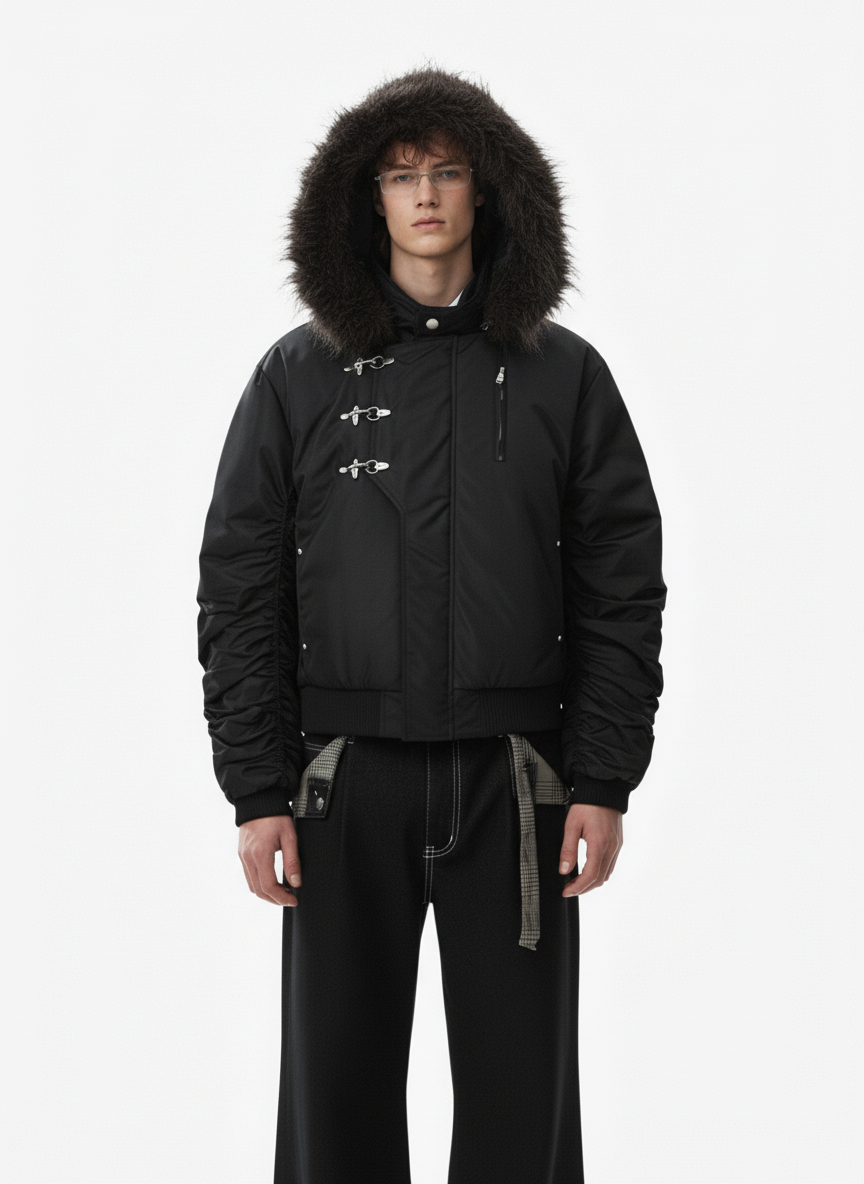 • Design Elements: Detachable faux fur hood trim, front toggle closures, quilted lining inside the hood