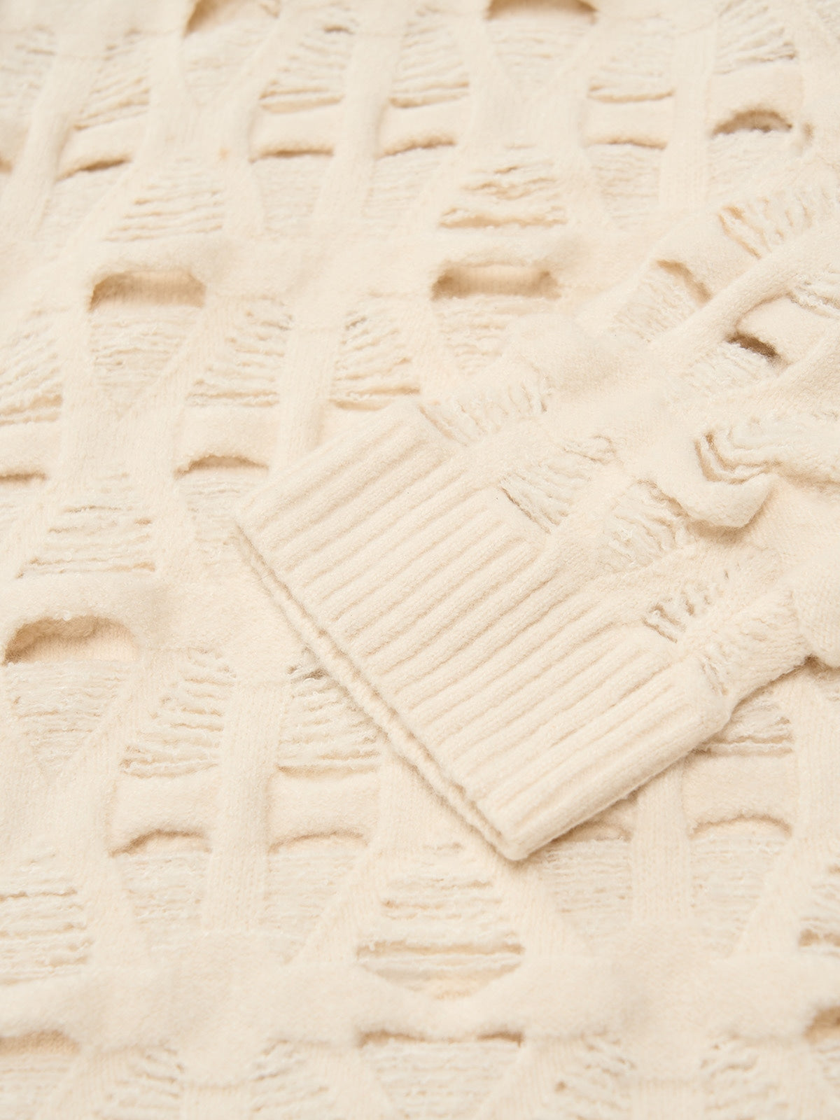 • Éléments de conception : motif unique en tricot ouvert, poignets et ourlet côtelés, col ras du cou classique