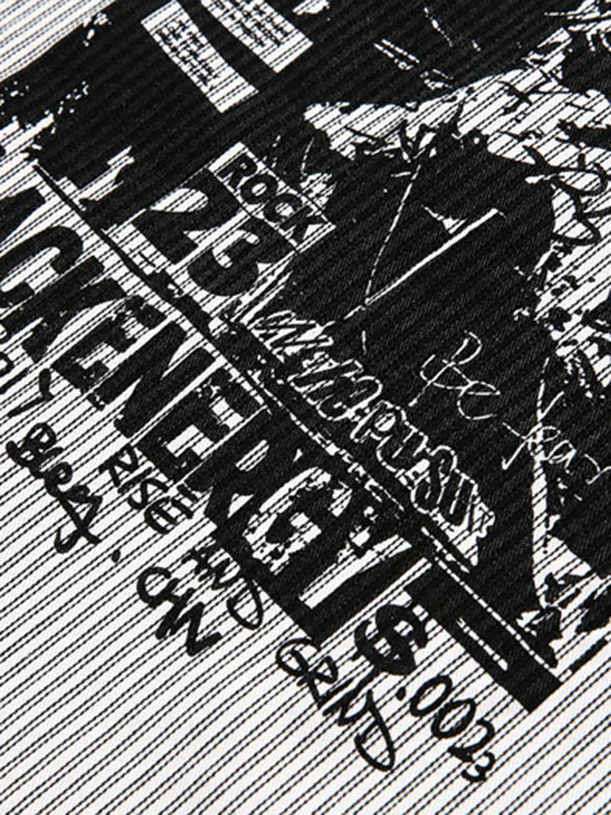 •    Design Elements: Chest graphic pocket, vertical stripe pattern, frayed hem detail
