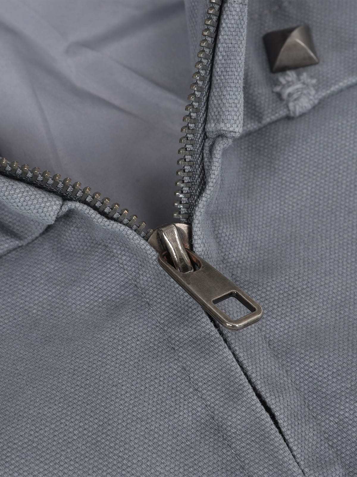 • Details: Decorative studs on shoulders and chest, faded wash effect, front zipper closure