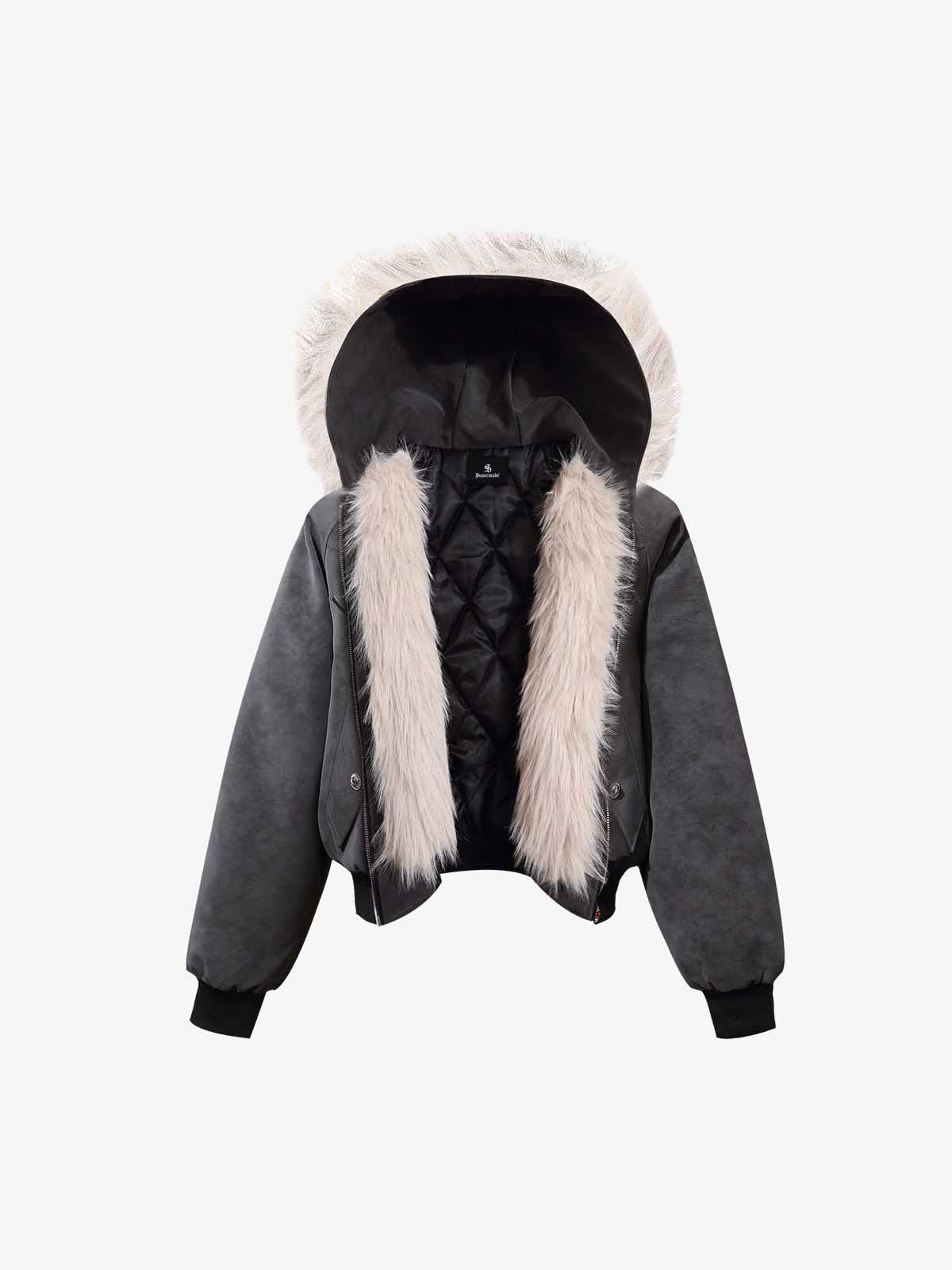 Faux Fur Trimmed Hood Suede Bomber Jacket