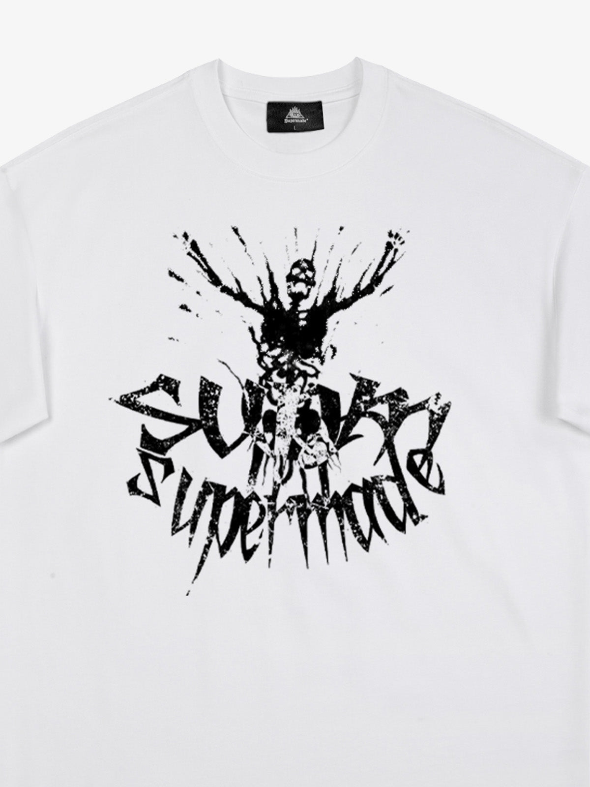 • Design Elements: Abstract Skull Graphic, Distressed Lettering, Layered Text Effect, Vintage Wash Look