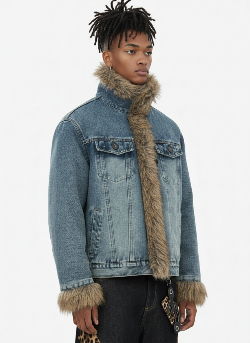 • Design Elements: Faux fur collar and cuffs, button closures, classic denim look