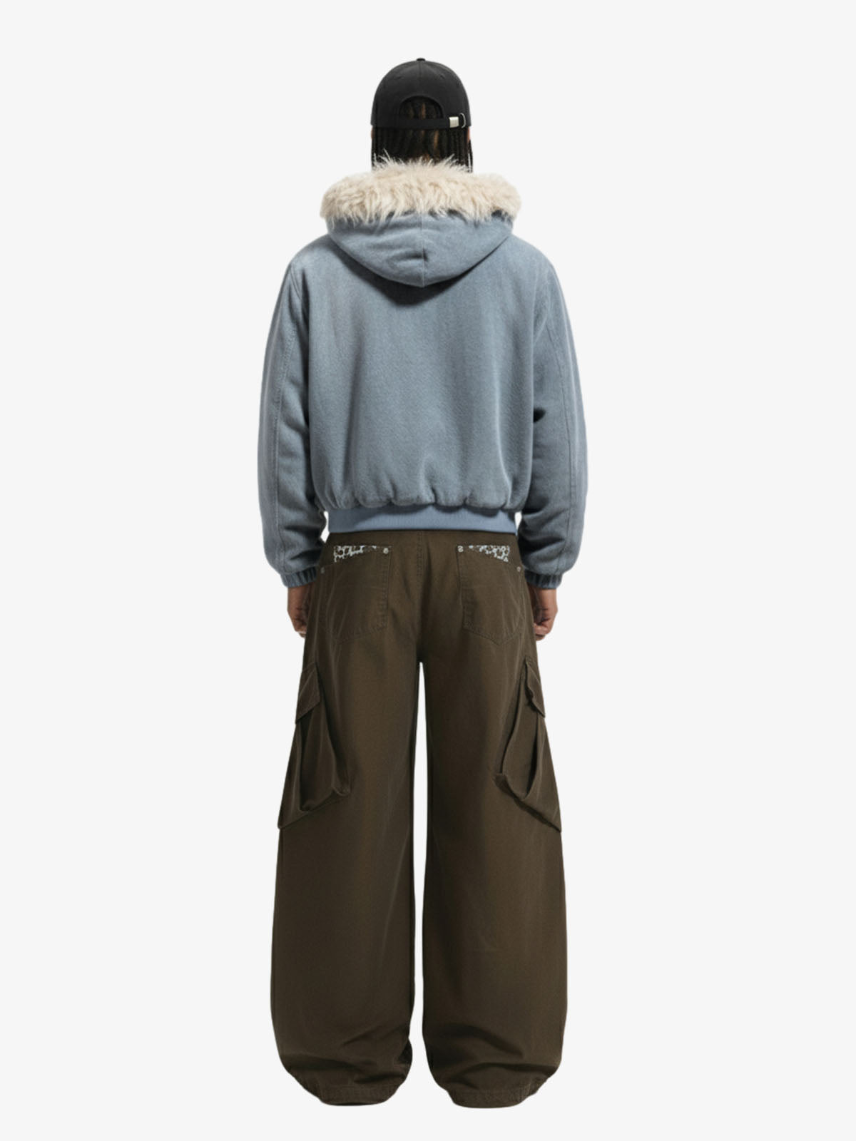 Washed Embroidered Fur-Lined Denim Bomber Jacket