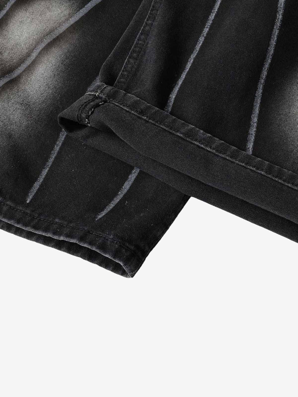 • Details: Camouflage Patch Pockets, Radiating Stripe Pattern, High-Waisted Design, Distressed Finish
