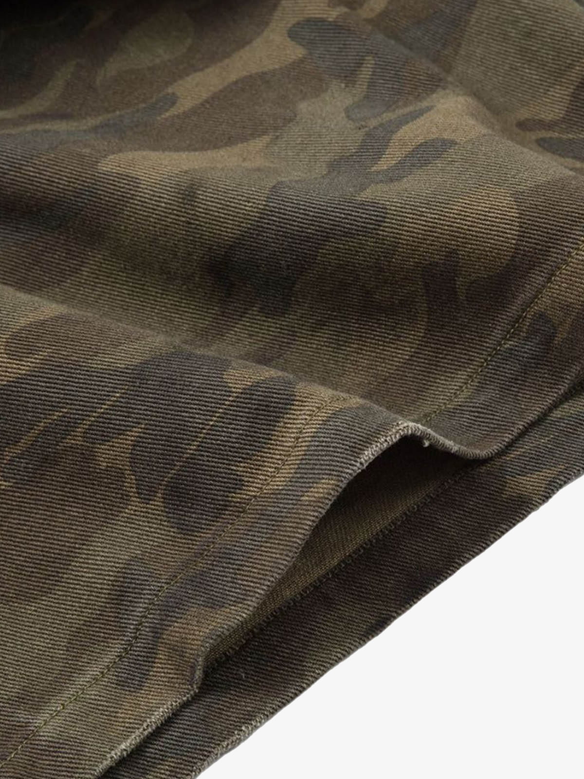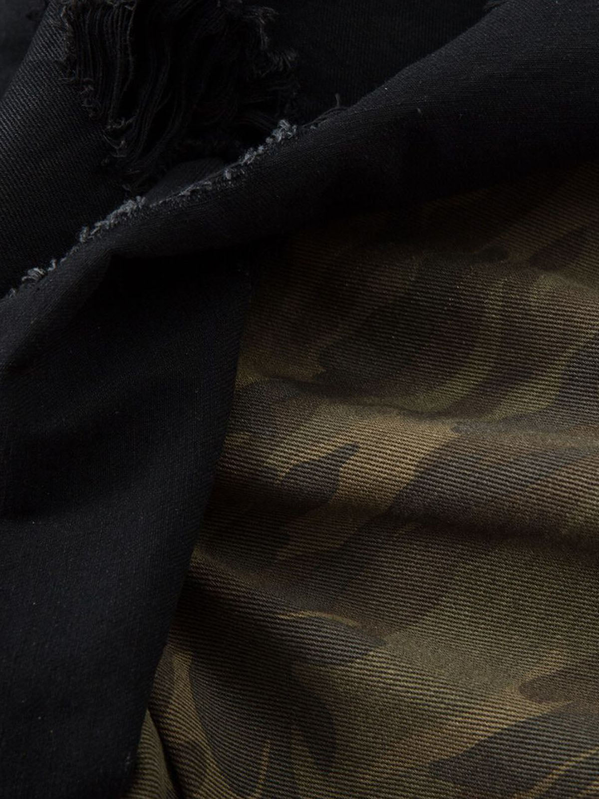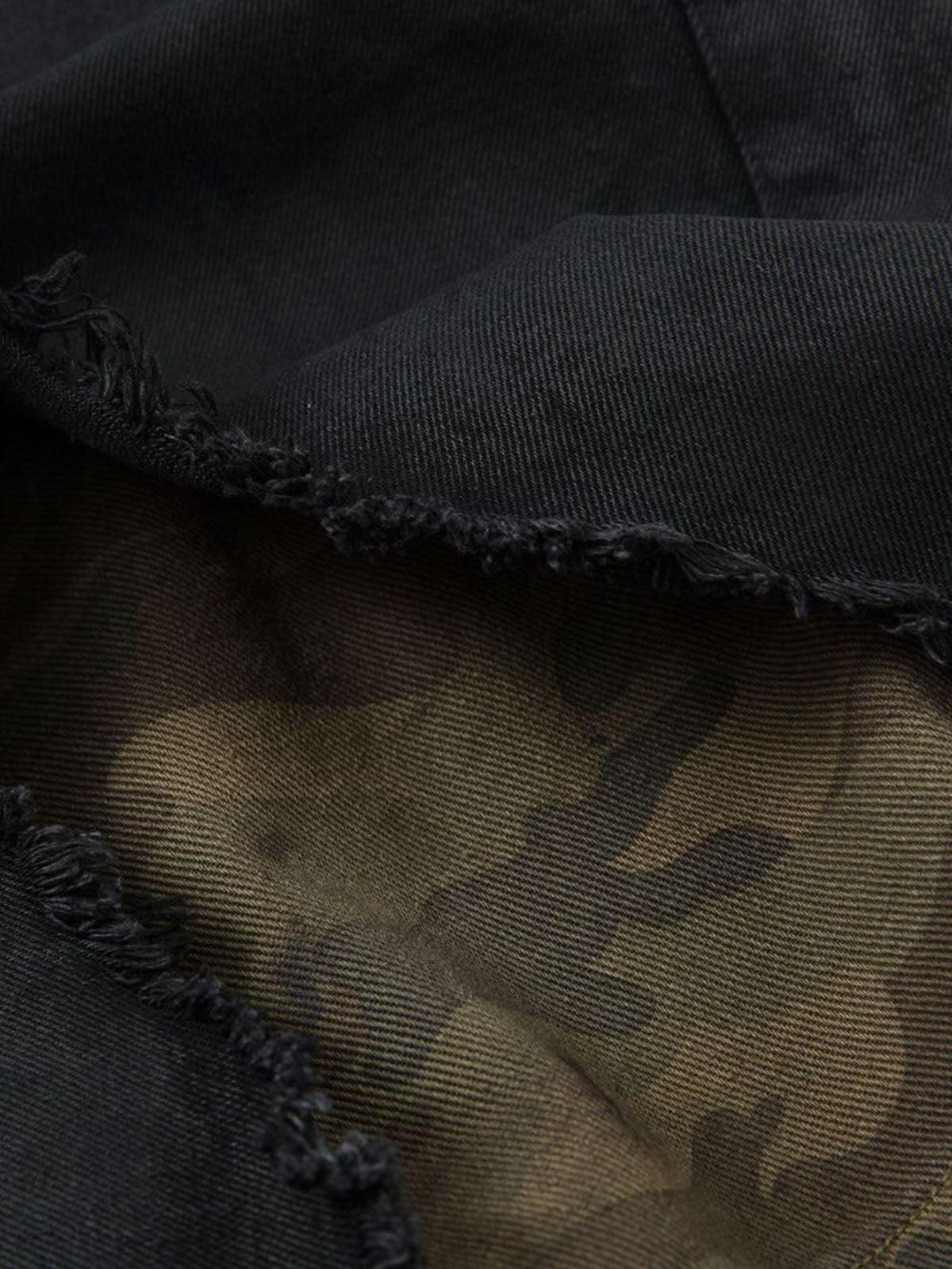• Design Elements: Ripped details, camouflage lining, frayed hem