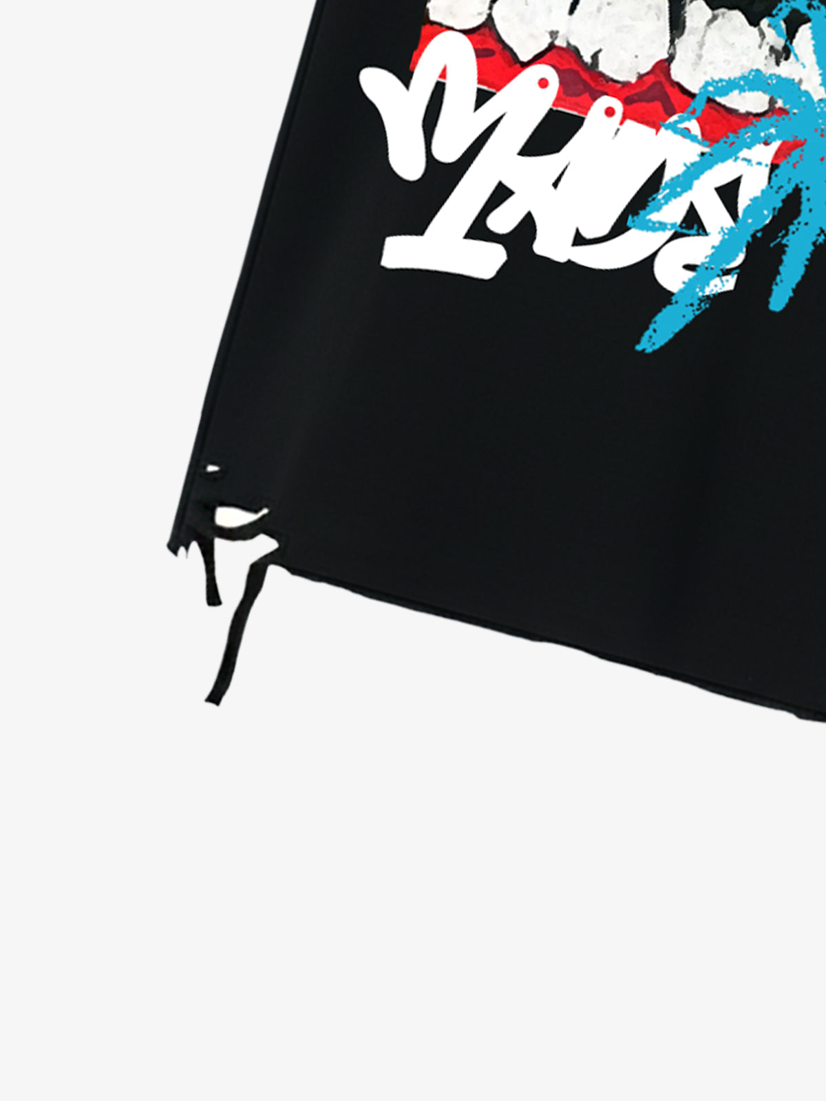 • Details: Black skull prints in multiple directions, flame-style text graphic across chest, distressed ripped hem on both sides