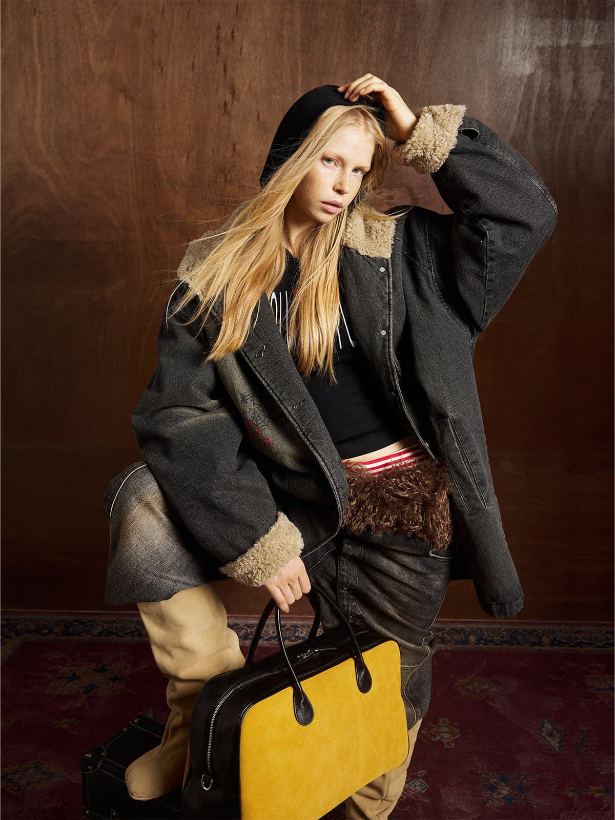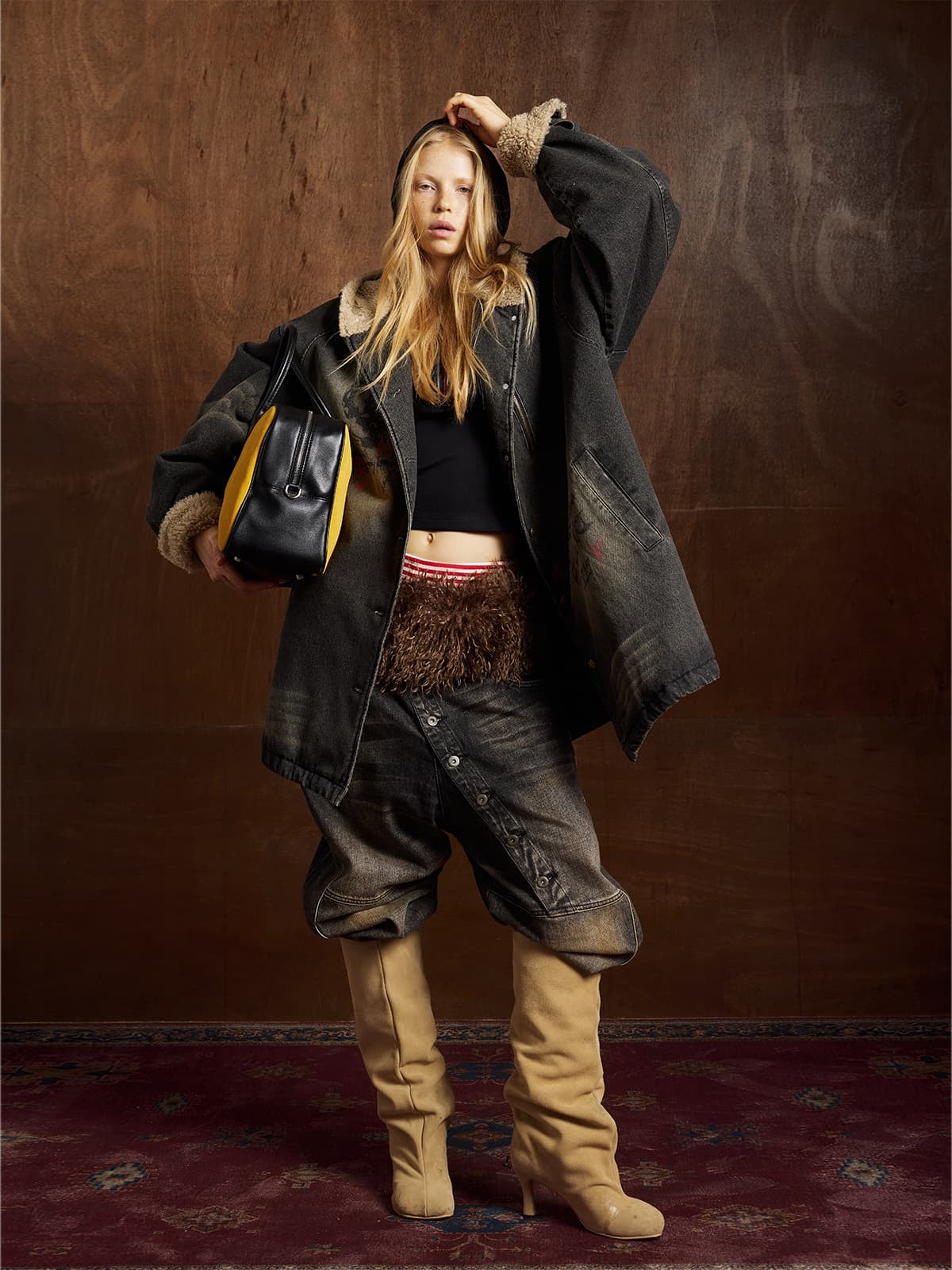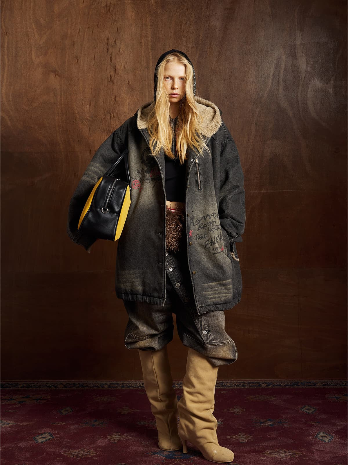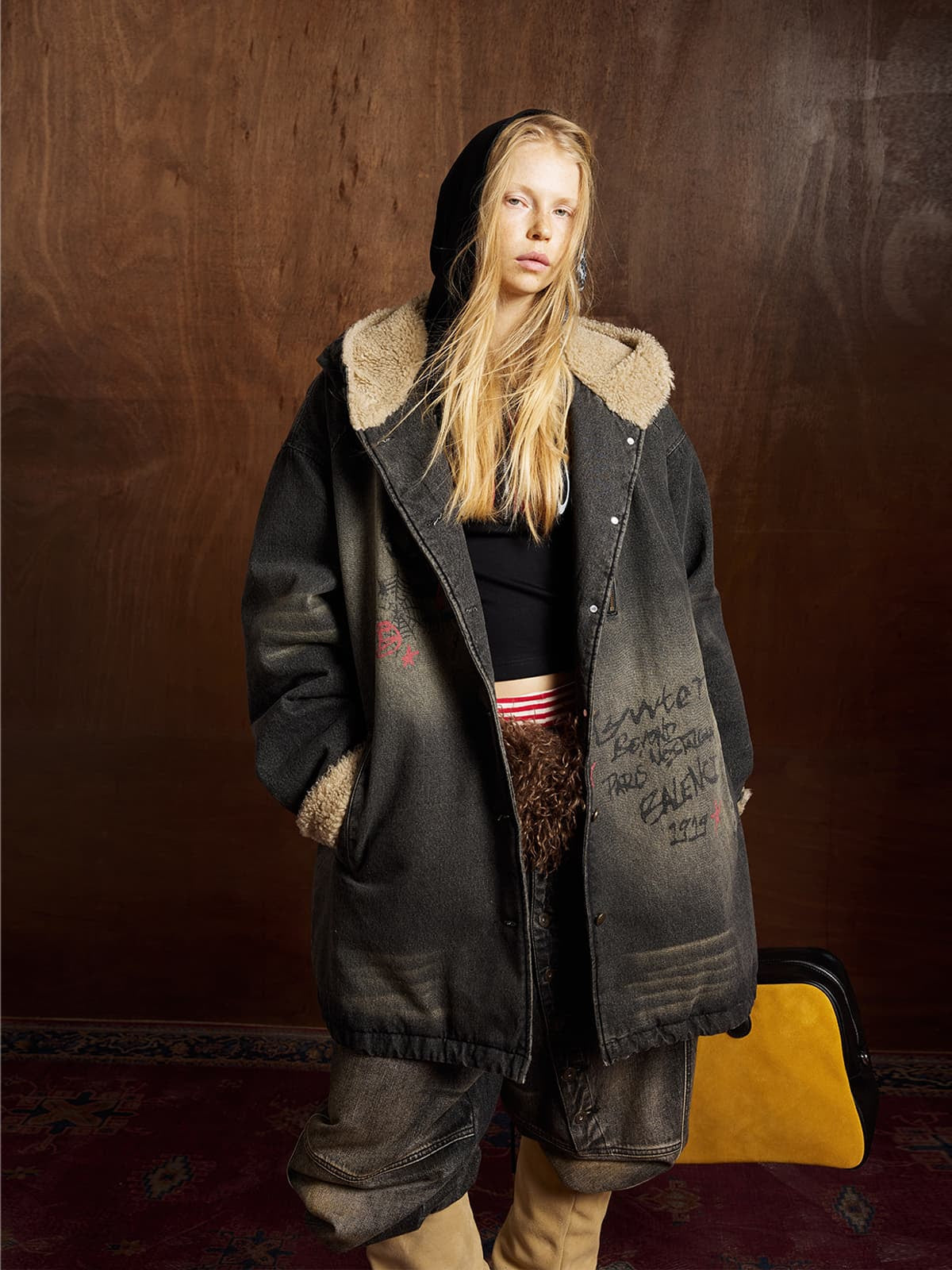 Distressed Graffiti Washed Long Lamb Fleece Denim Cotton Coat