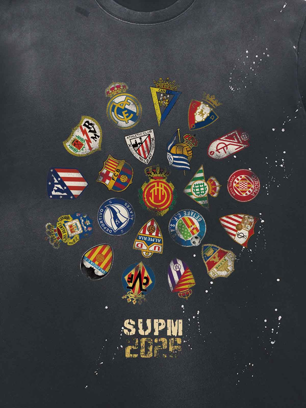 This graphic T-shirt features a distressed ink splatter design paired with a bold team-style logo, creating a raw vintage streetwear aesthetic. The textured print and worn graphic effect give it an authentic, lived-in look that stands out without trying too hard. Easy to style with denim, cargos, or shorts, it brings a strong graphic statement to everyday outfits.