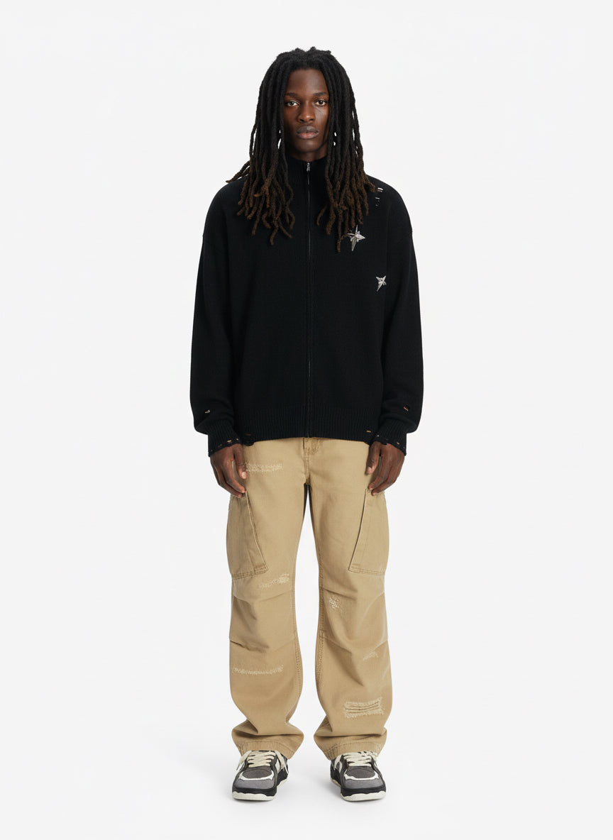 Distressed Ripped-Edge Turtleneck Diamond Star Zipper Knitted Sweater