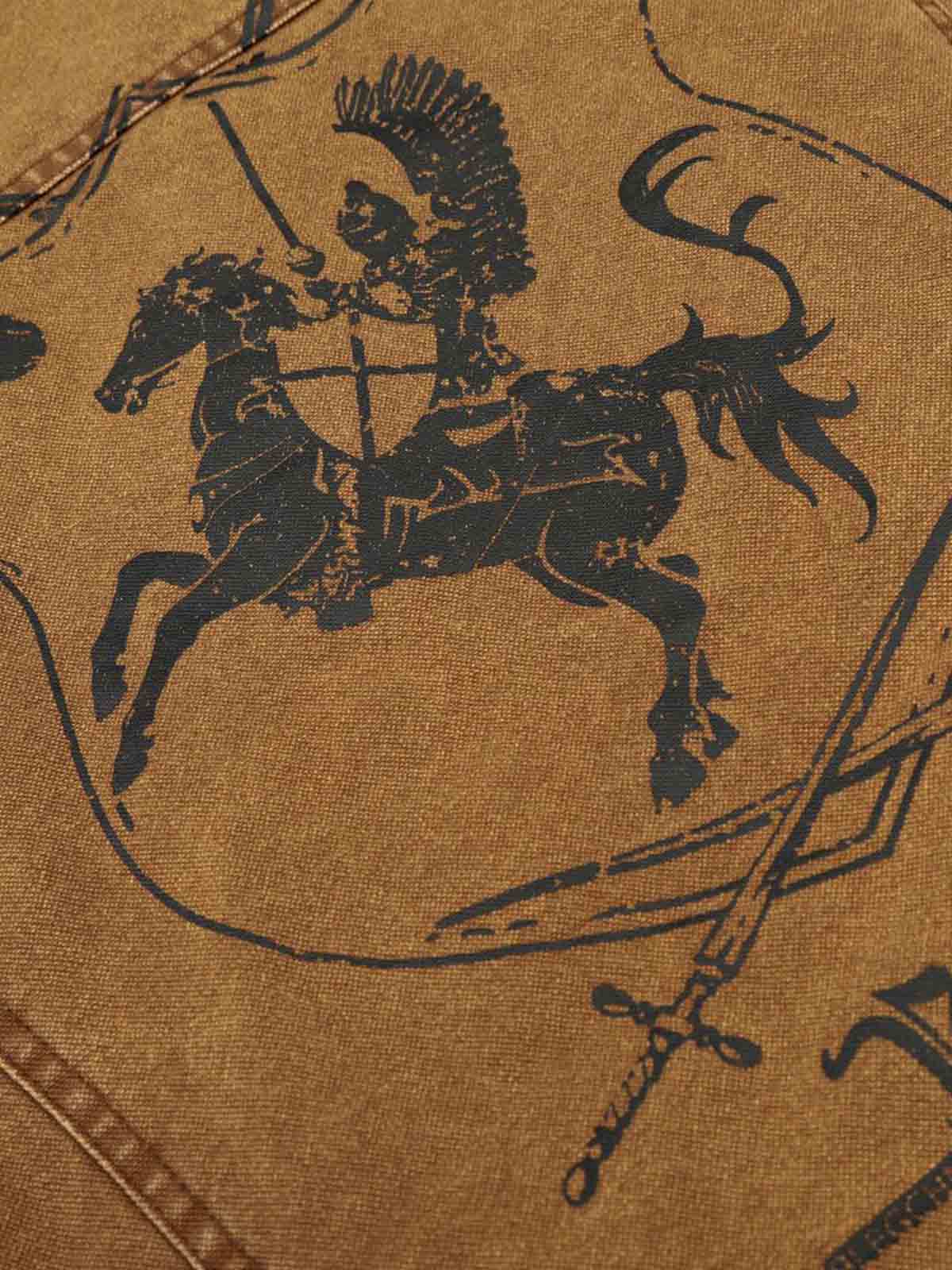 • Details: Back crest embroidery featuring a knight on horseback, crossed swords, and decorative flags; two side flap pockets with snap closures