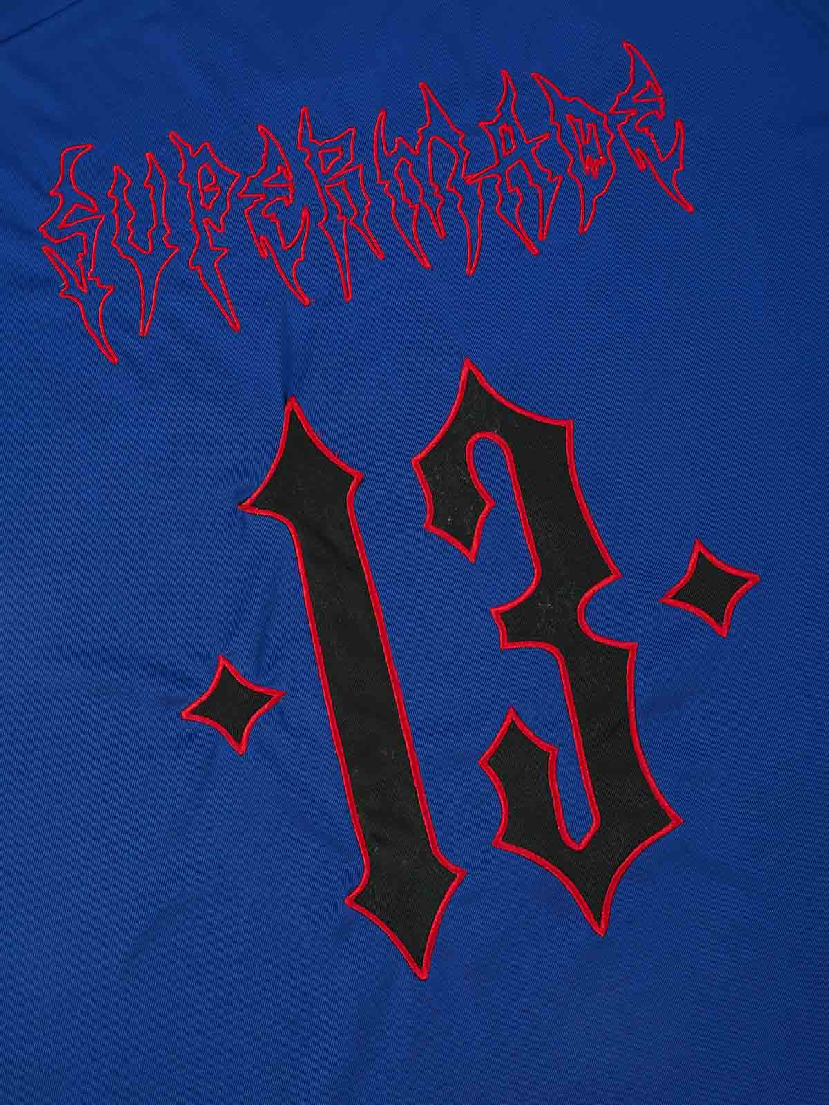 Constructed from woven polyester fabric, this jersey T-shirt channels a fusion of sportswear structure and gothic street aesthetics. The piece features oversized number graphics layered over mesh panel visuals, paired with gothic typography and embroidered detailing for added texture and dimension. Contrast piping and a ribbed V-neck collar enhance the athletic silhouette, delivering a statement look built for both street styling and casual wear.