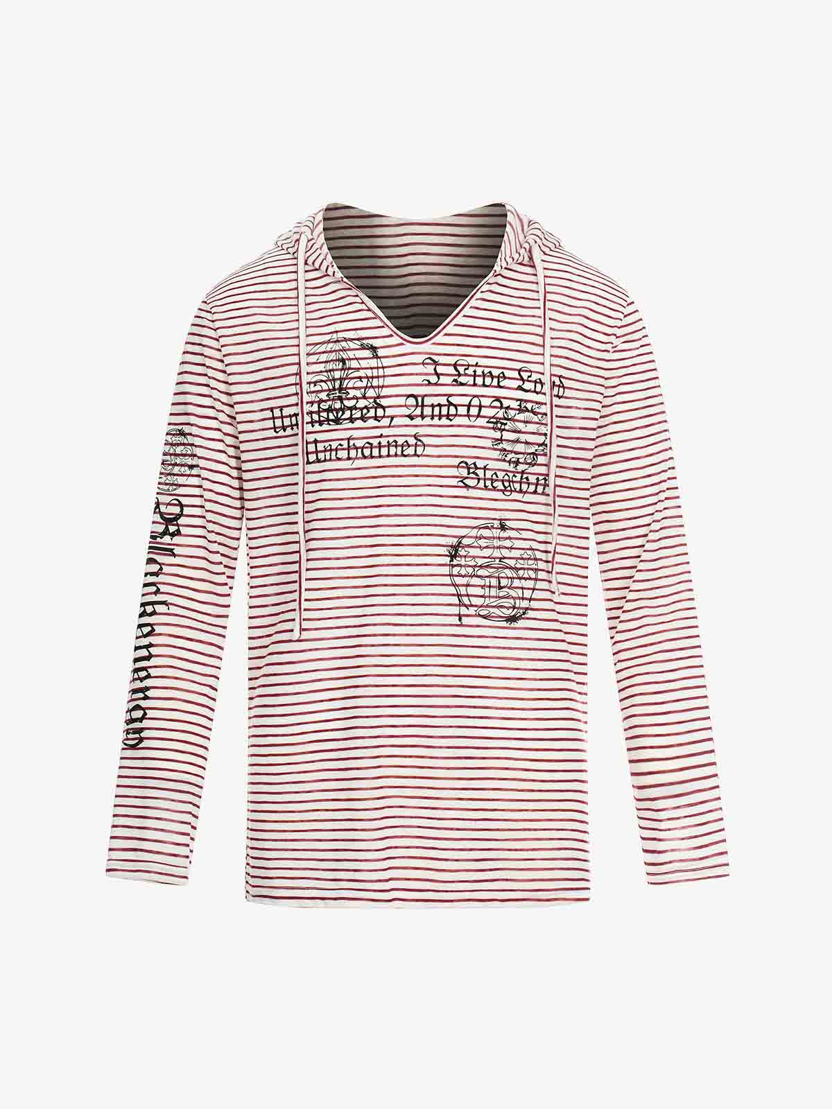 Graphic Print and V-Neck Striped Long Sleeve Hooded T-Shirt