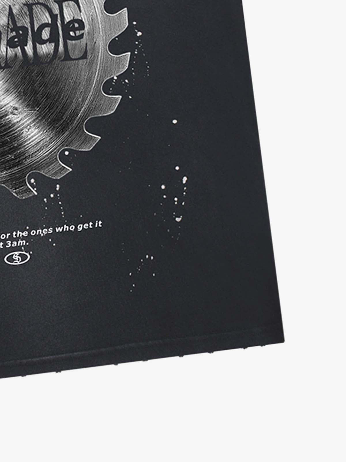 • Detail Features: Central Snake Coiled Around Sword Graphic, Splatter Print Accents, Textual Slogan at Bottom Hem