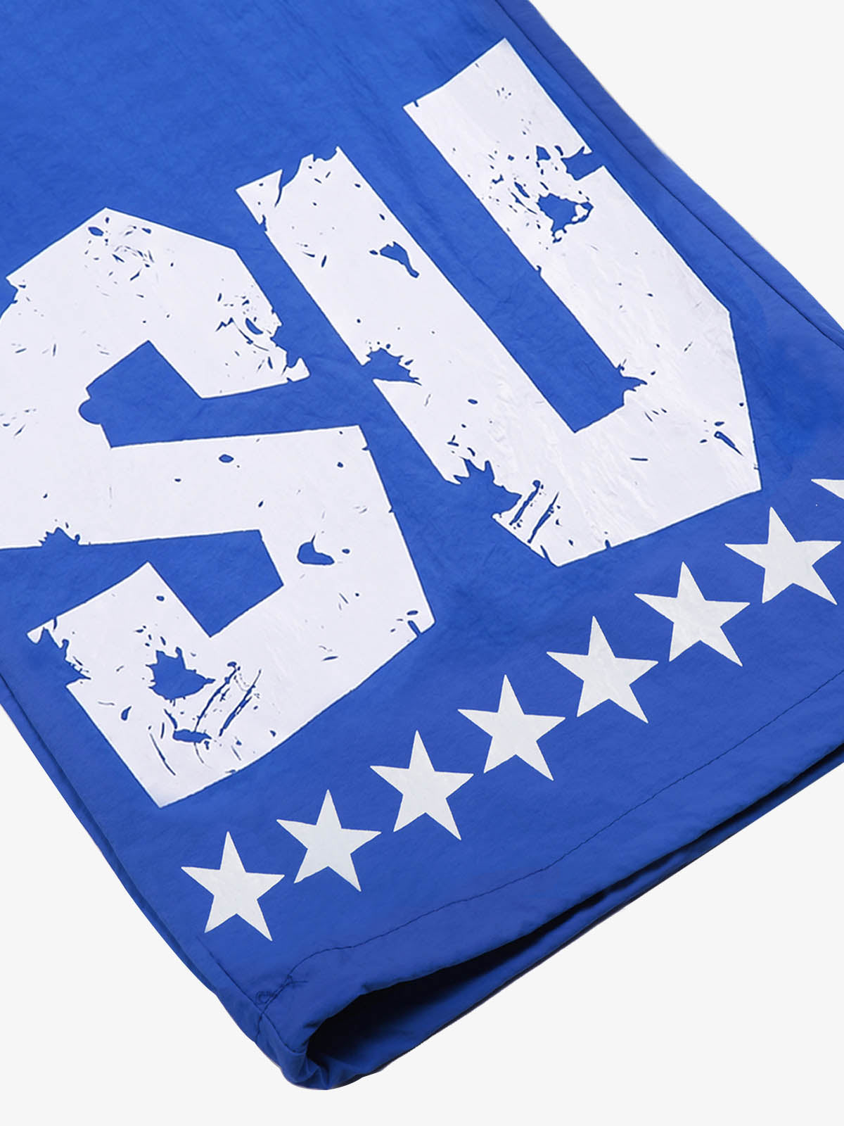 High-octane streetwear meets functional techwear. Crafted from lightweight nylon with a crisp texture, these pants feature a pre-styled layered waistband accented by a repeating skull motif. Bold, cracked-effect lettering and star graphics anchor the oversized silhouette.