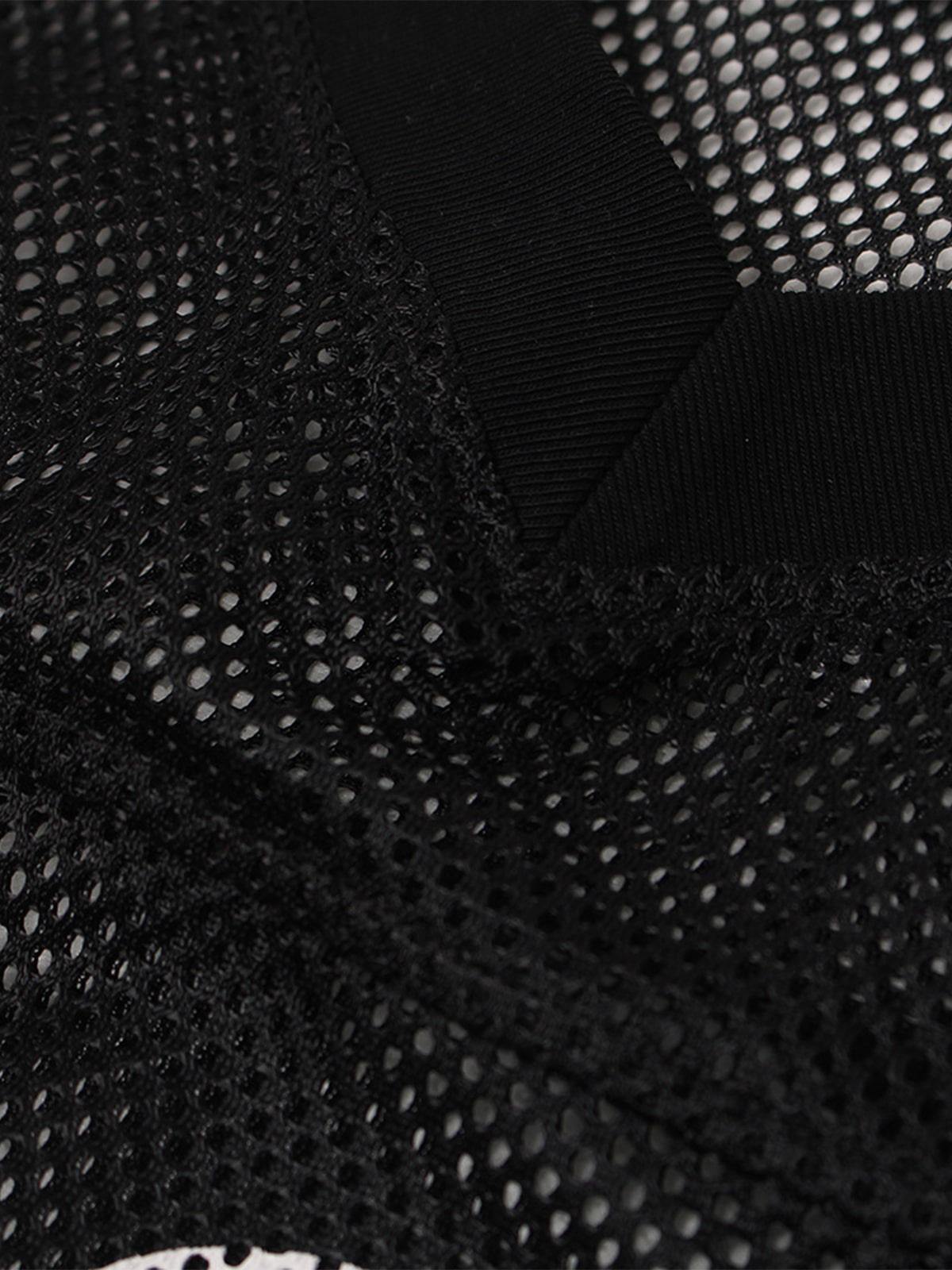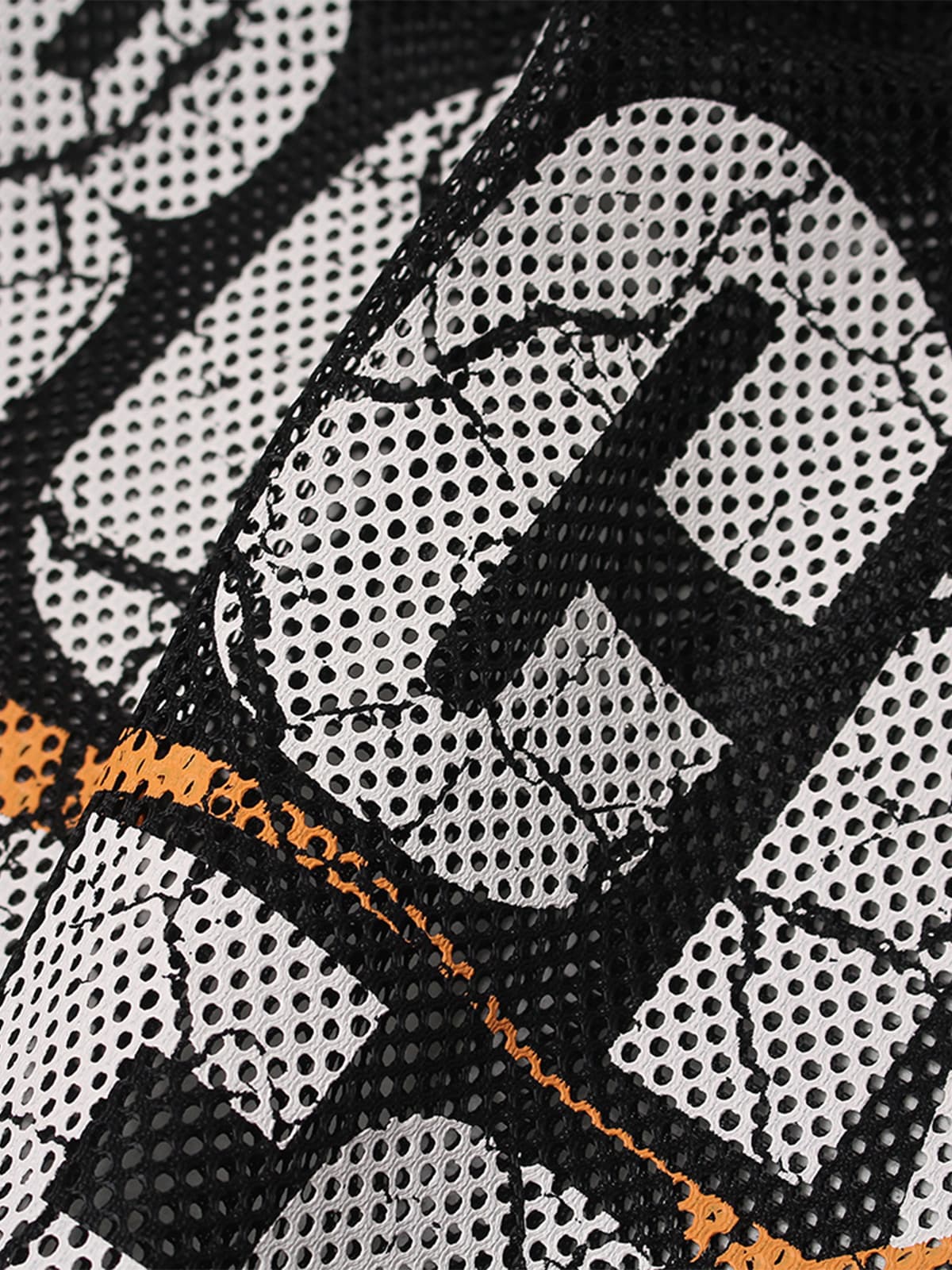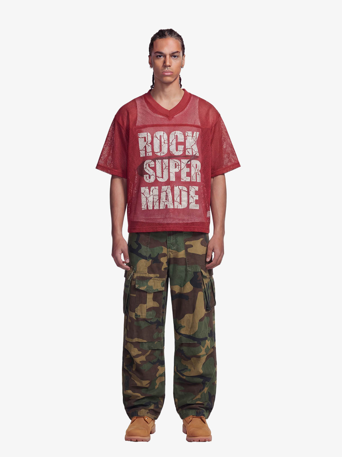 Constructed with a street-driven athletic aesthetic, this mesh football jersey T-shirt features bold “Rock Super Made” lettering layered over a distressed washed surface. The breathable open-hole mesh construction enhances airflow while reinforcing its sport-meets-street identity. Finished in a relaxed cropped silhouette, the piece delivers strong blokecore energy for everyday styling, layering, and statement summer wear.