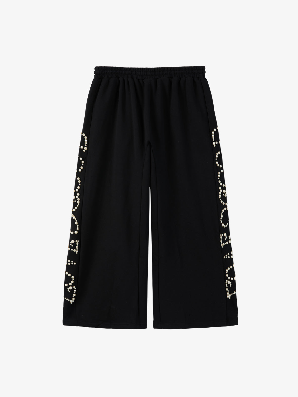 Constructed from a soft cotton-blend fabric, these wide-leg sweatpants deliver a relaxed unisex silhouette with a clean drape. The side panels are detailed with pearl embellishments forming subtle graphic patterns, adding texture and visual contrast. Finished with an elastic waistband and adjustable drawstring, they balance comfort and statement styling for everyday wear.