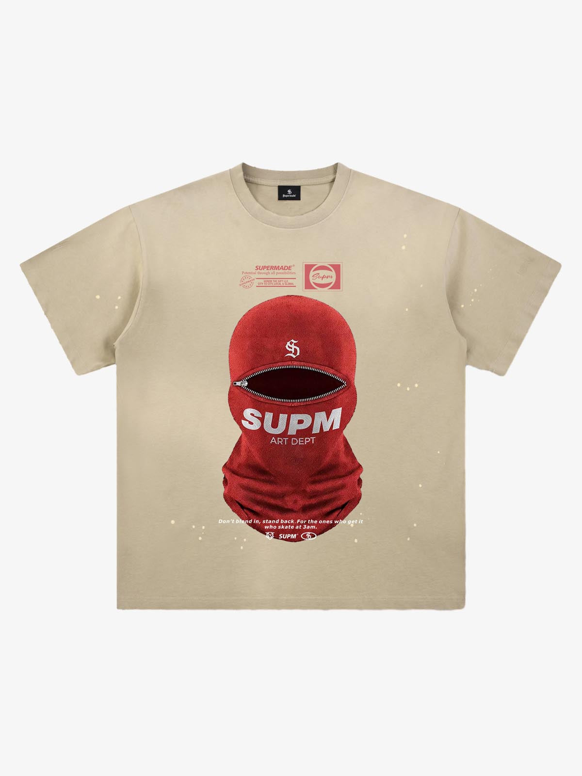 • Design Elements: Central Snake Wrapped Around Sword Graphic, Splatter Effect Print, Minimalist Text Slogan