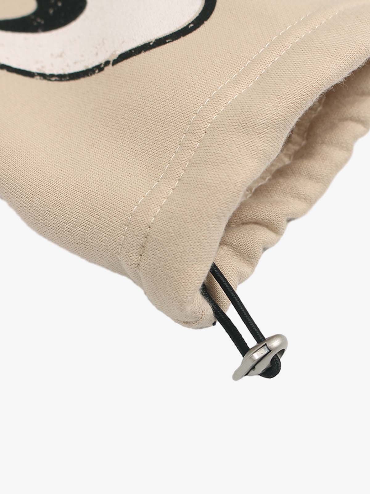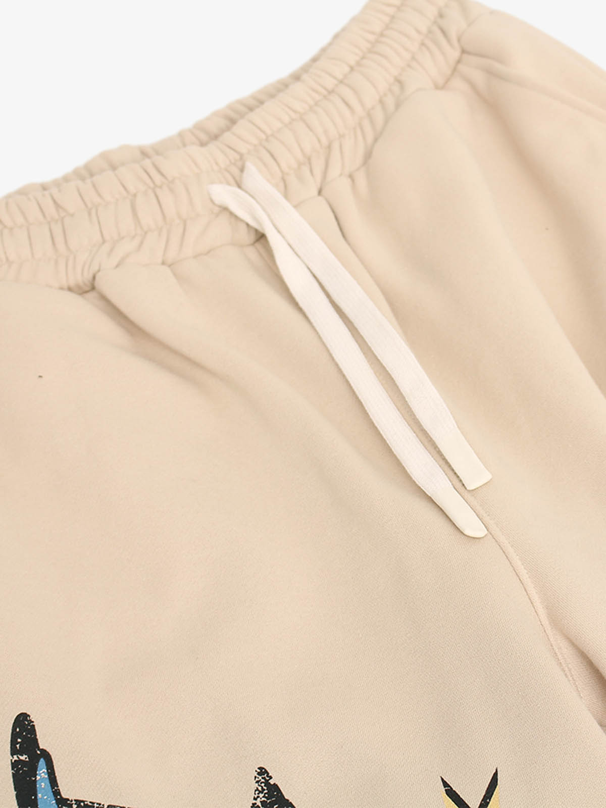 • Design Elements: Bold vertical lettering with star patterns, elastic waistband with drawstring