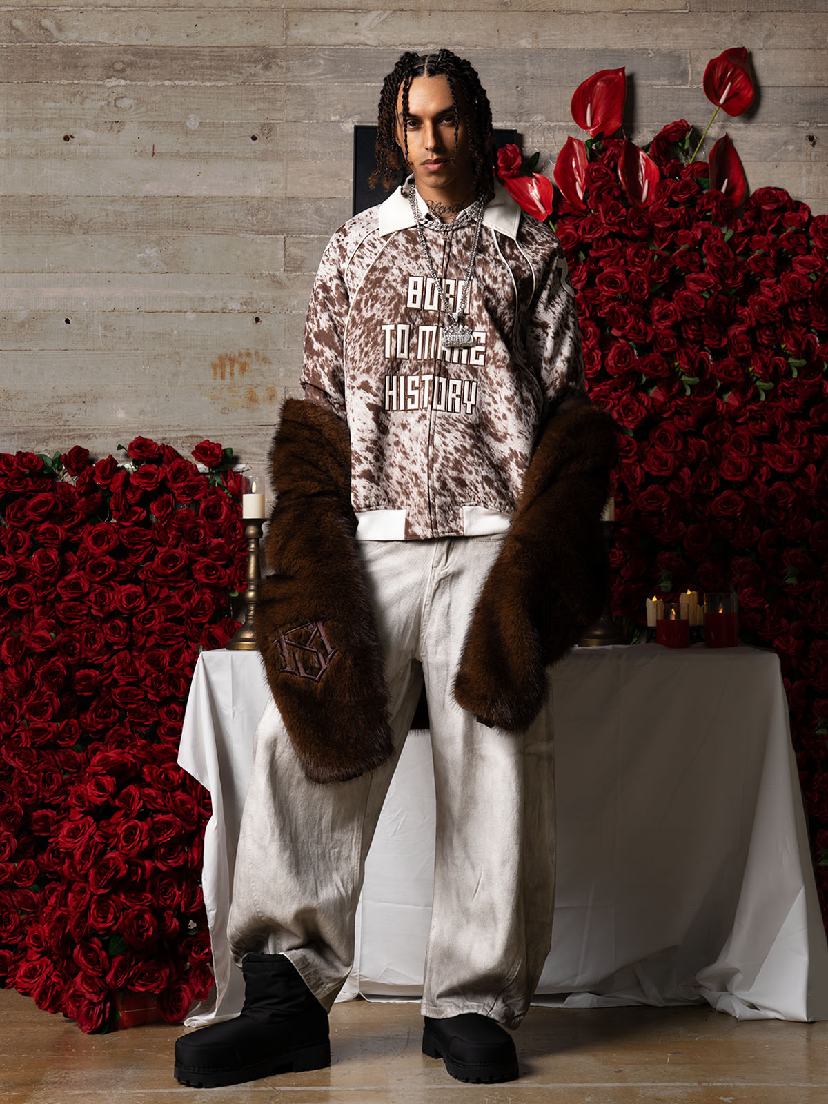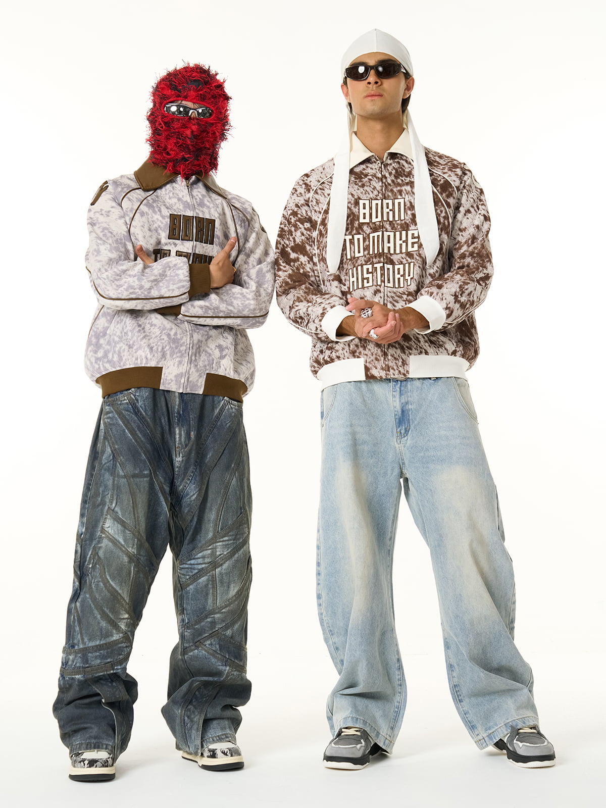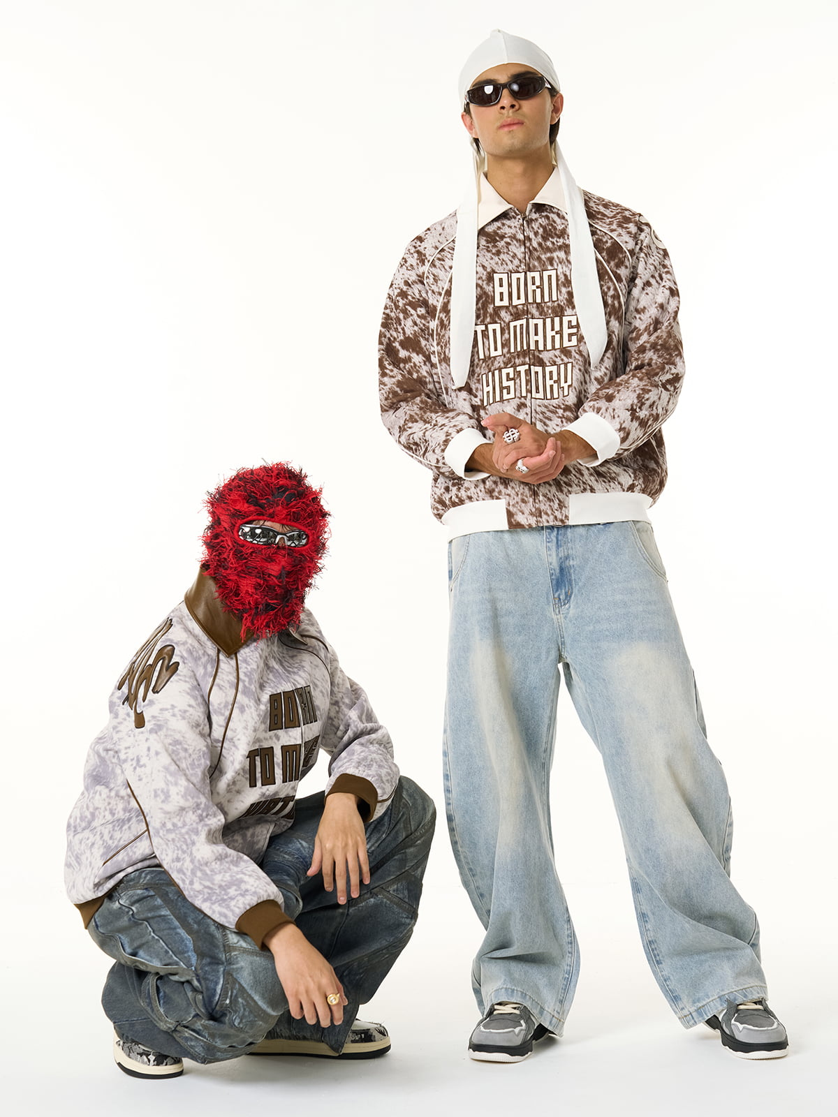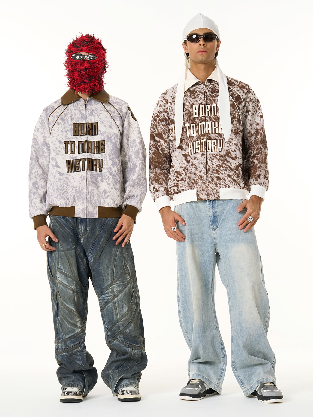 • Design Elements: Bold "Born to Make History" text print, cow print pattern, relaxed fit jeans