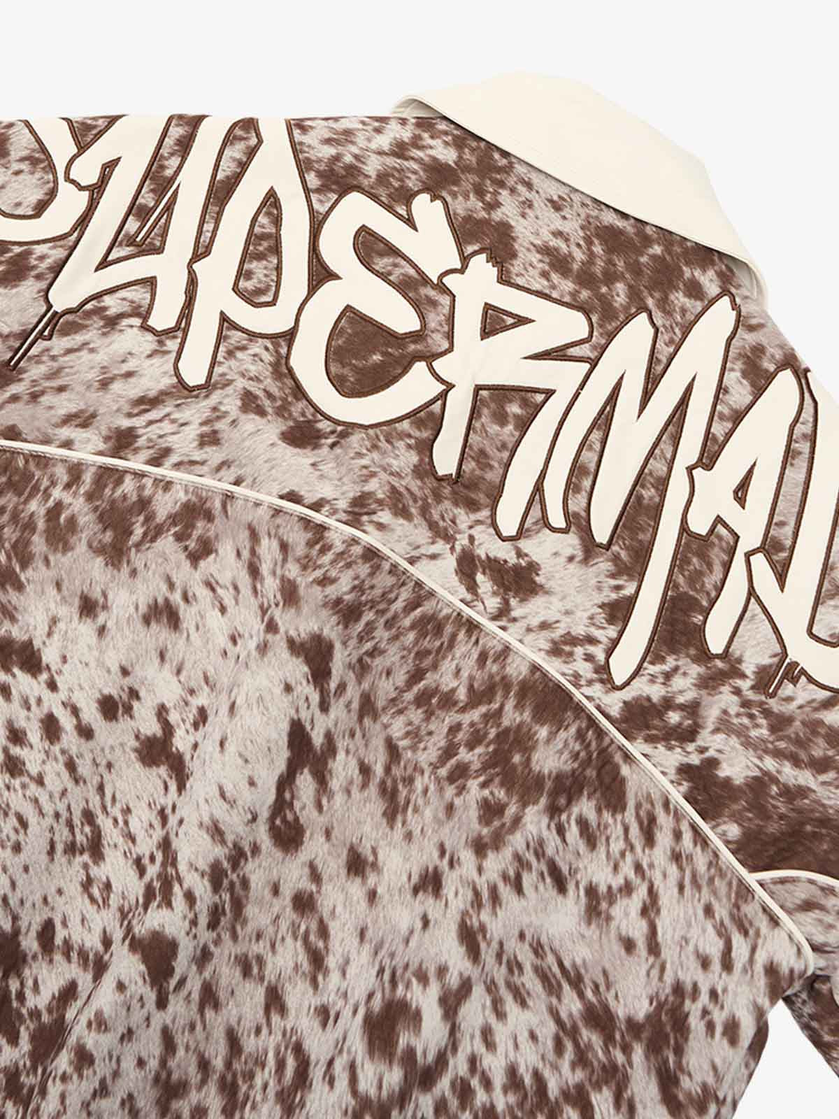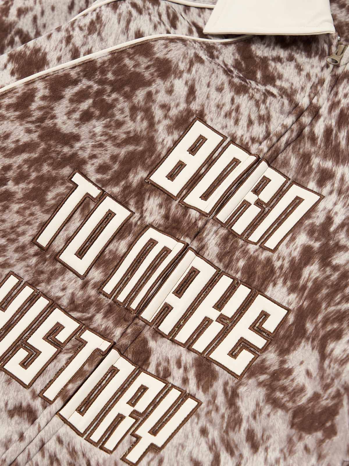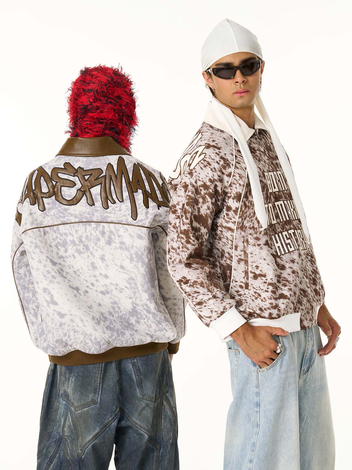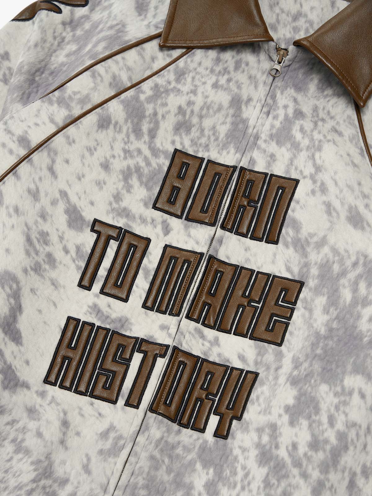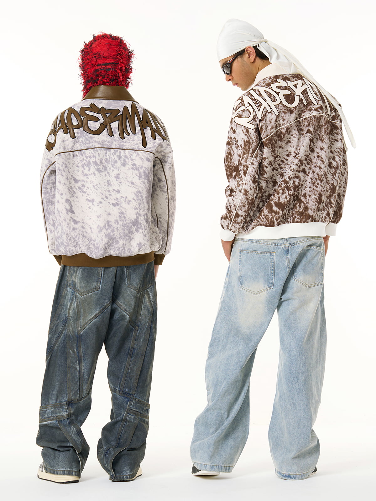 • Design Elements: Bold "Born to Make History" text print, cow print pattern, relaxed fit jeans