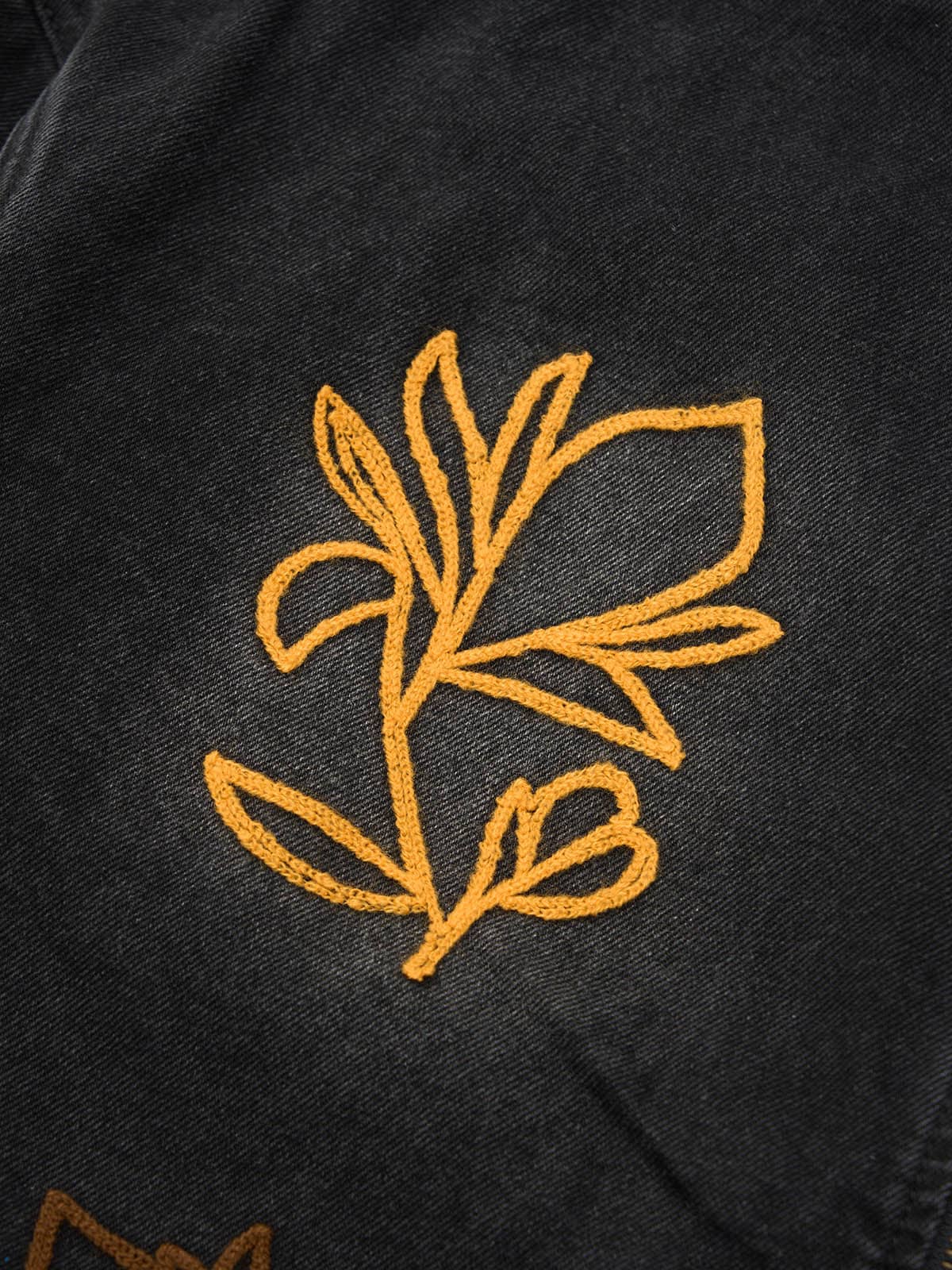 • Design Elements: Embroidered floral patterns, bold lettering on the T-shirt, layered look with a denim jacket
