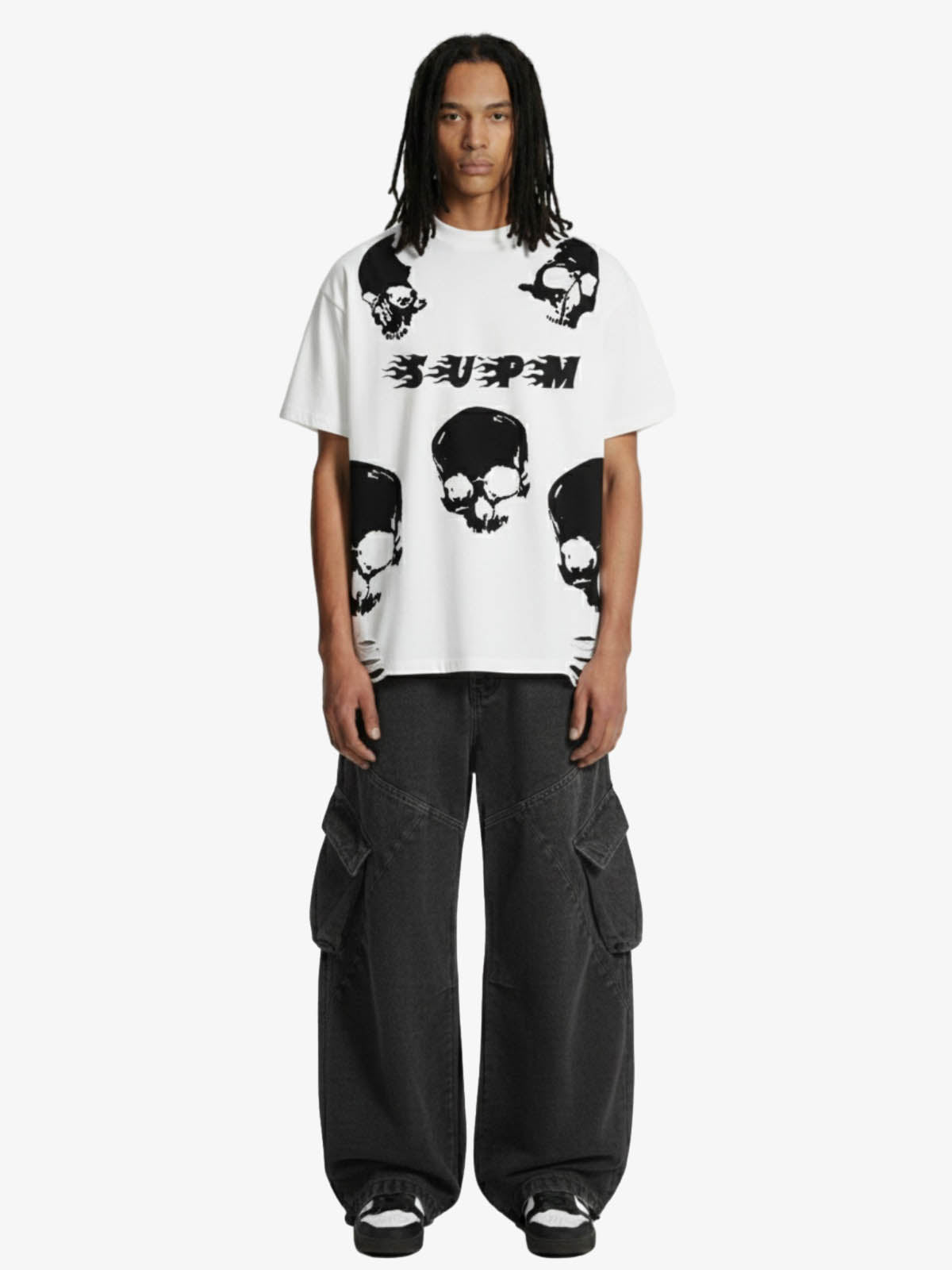 • Details: Graphic skull prints, flame-style logo, ripped hem details