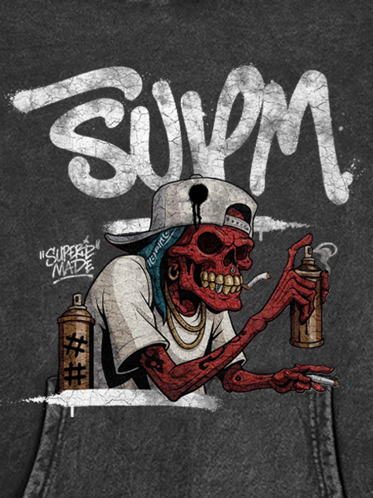 • Design Elements: Bold graffiti-style “SUPM” lettering, vibrant skeleton spray-painting graphic, vintage washed effect